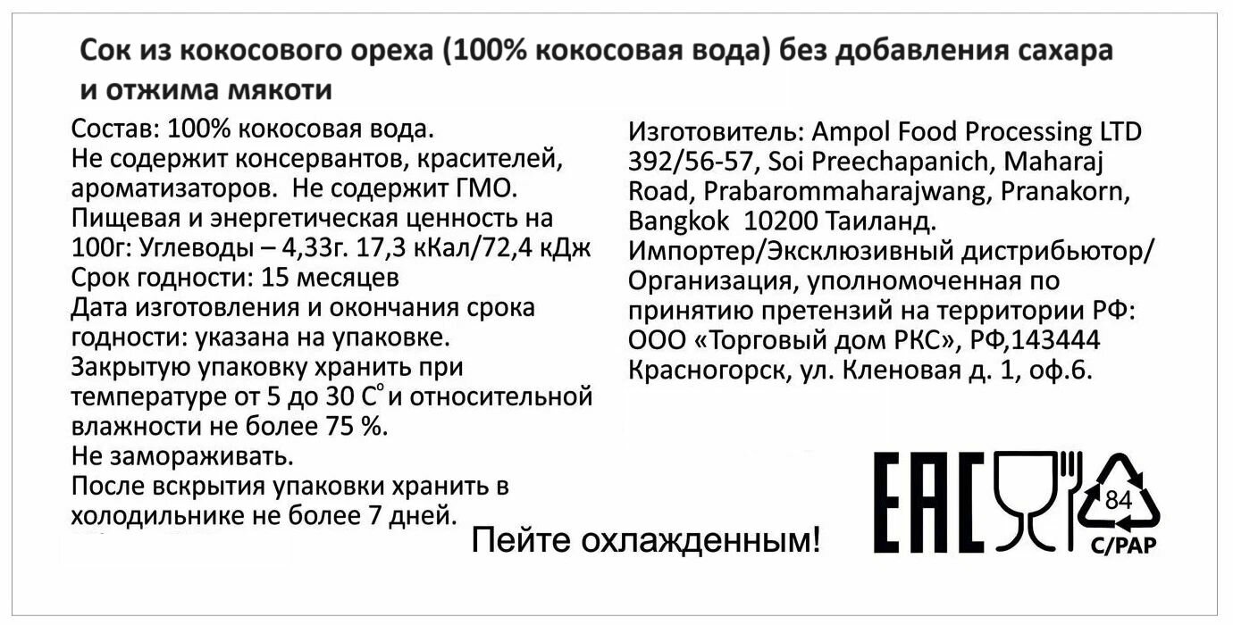 | Состав | 100% кокосовая вода Не содержит консервантов, красителей, ароматизаторов. Не содержит ГМО. |