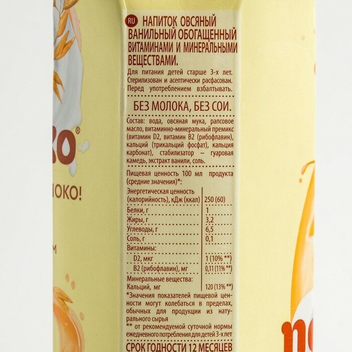 | Состав | вода, овсяная мука, рапсовое масло, витаминно-минеральный премикс (витамин D2, витамин В2 (рибофлавин), кальций (трикальций фосфат), кальция карбонат), экстракт ванили, соль |