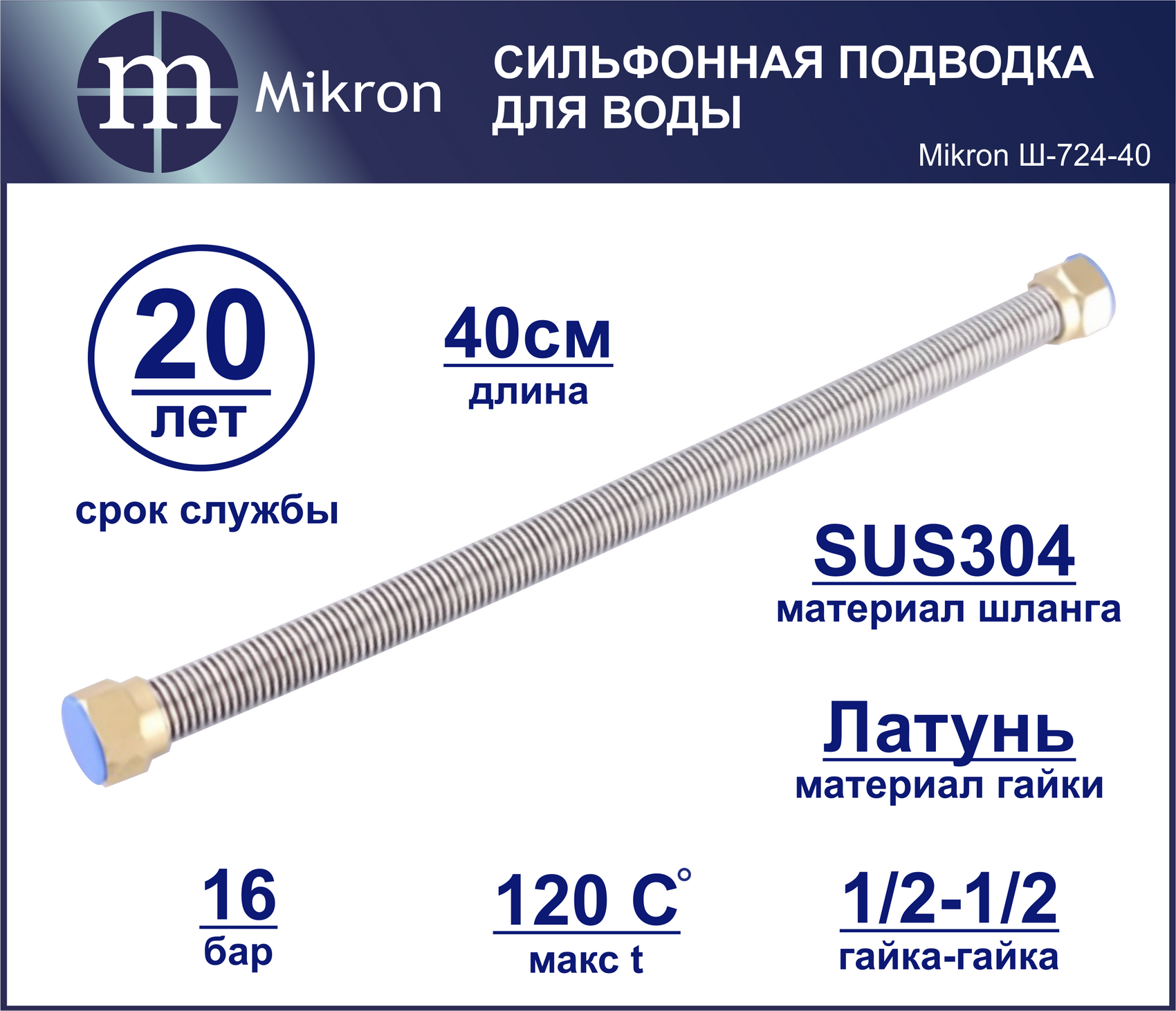 Гибкая сильфонная подводка для воды 1/2-1/2 40 см Mikron Ш-724-40 из нержавеющей стали повышенной гибкости удобна в монтаже интересное: