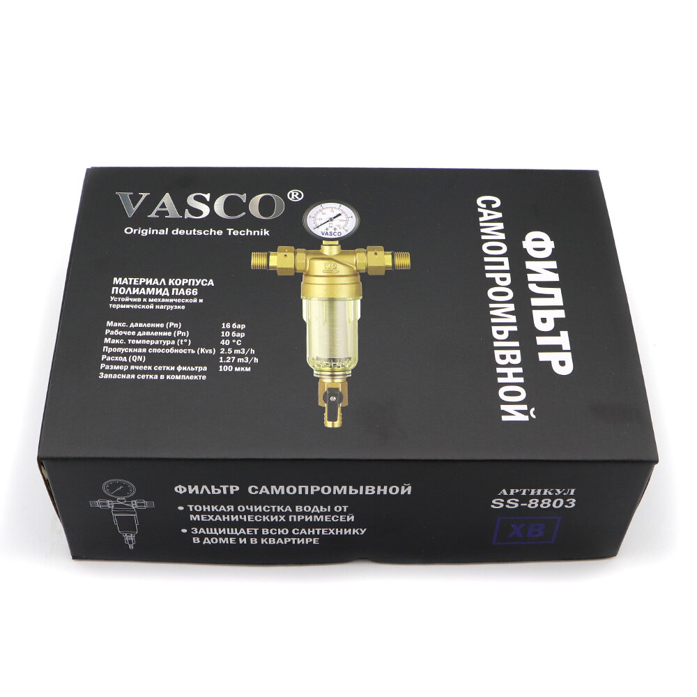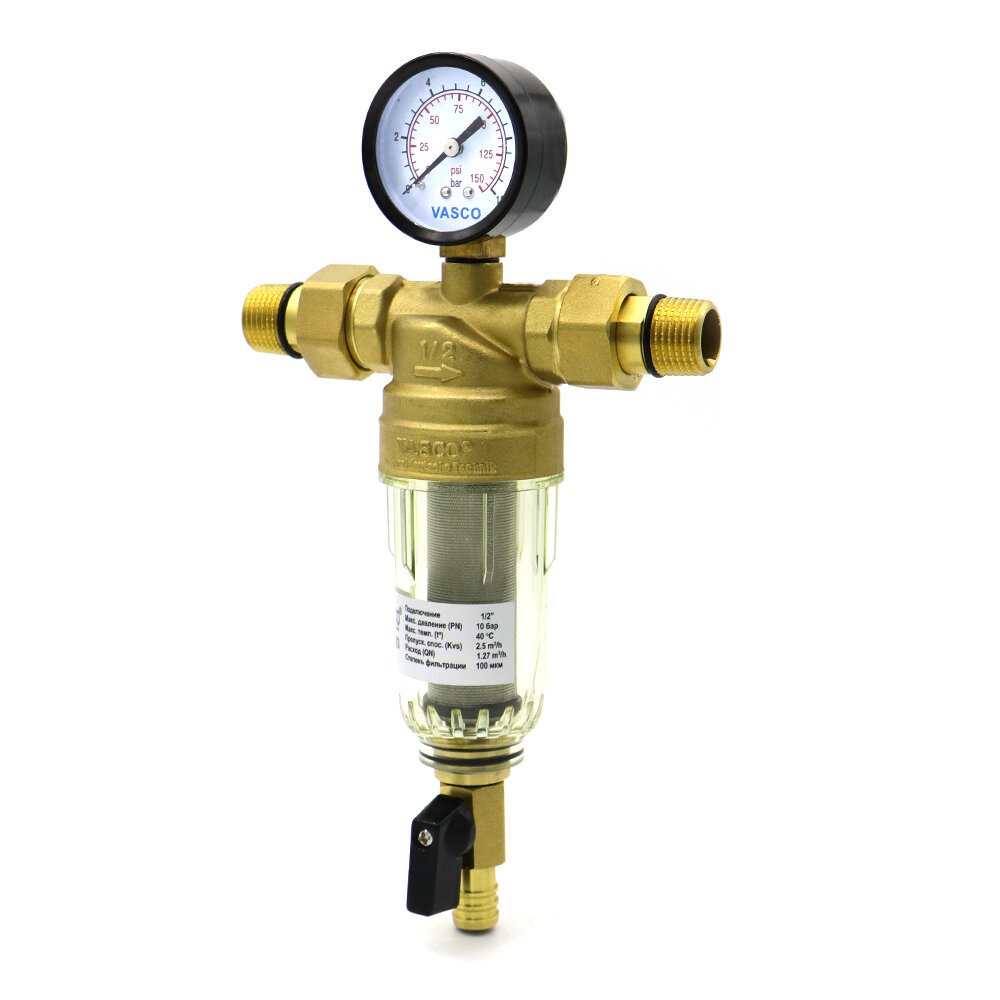 Купить Самопромывной фильтр с манометром VASCO диаметром на 1/2" для холодной воды, модель 8803