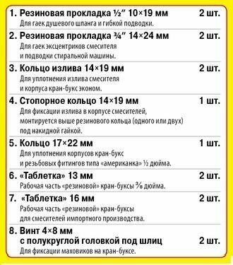 | Комплектация | прокладка эксцентрика, прокладка душевого шланга, прокладка запорная, прокладка вентильной головки, резиновое кольцо вентильной головки, винт 4 х 8, стопорное кольцо излива, резиновое кольцо излива, кольцо посадочное |