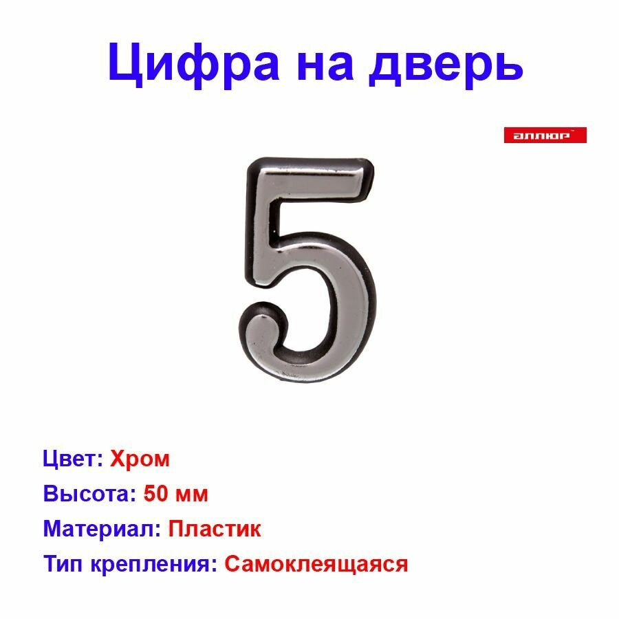 Аллюр Цифра дверная Большая пластик "5" (хром) клеевая основа