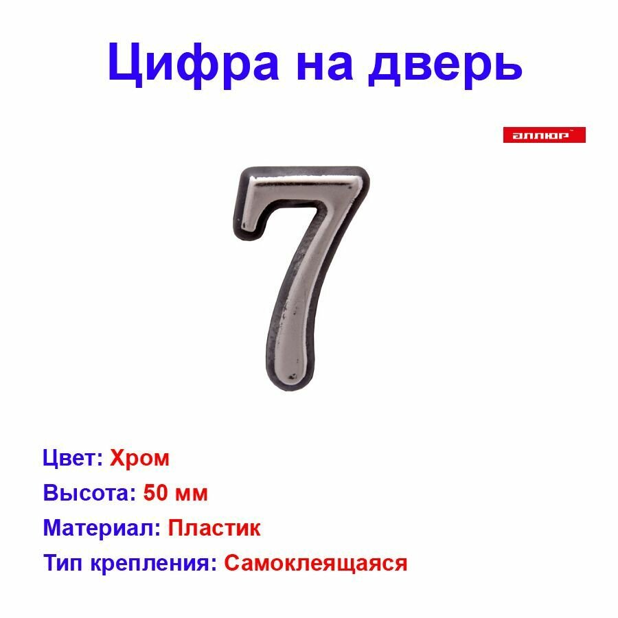 Цифра дверная металлическая на клеевой основе Аллюр "7" хром / Цифра на дверь