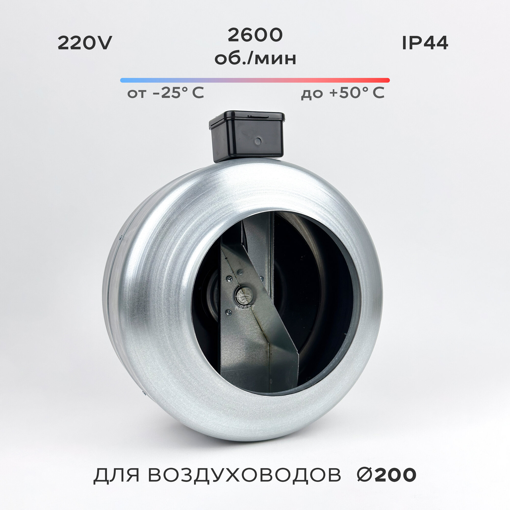 Купить Вентилятор канальный круглый ВКК-200 в металлическом корпусе, 220В, 1000 м3/час, 410 Па, 150 Вт, для круглых воздуховодов диаметром 200 мм, IP 44