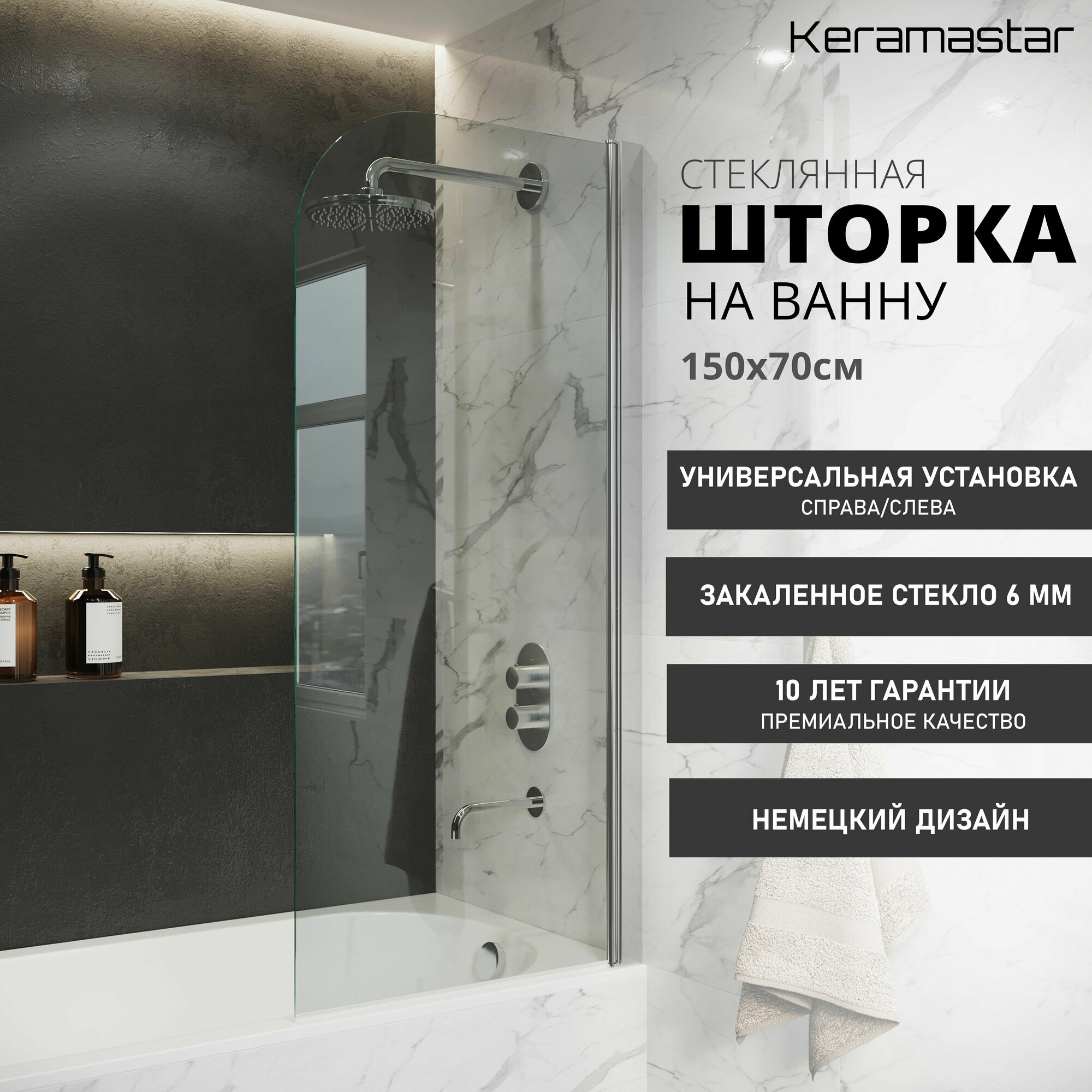 Шторка для ванны прозрачная Keramastar Supra KR065041 (150х90) стекло 6мм