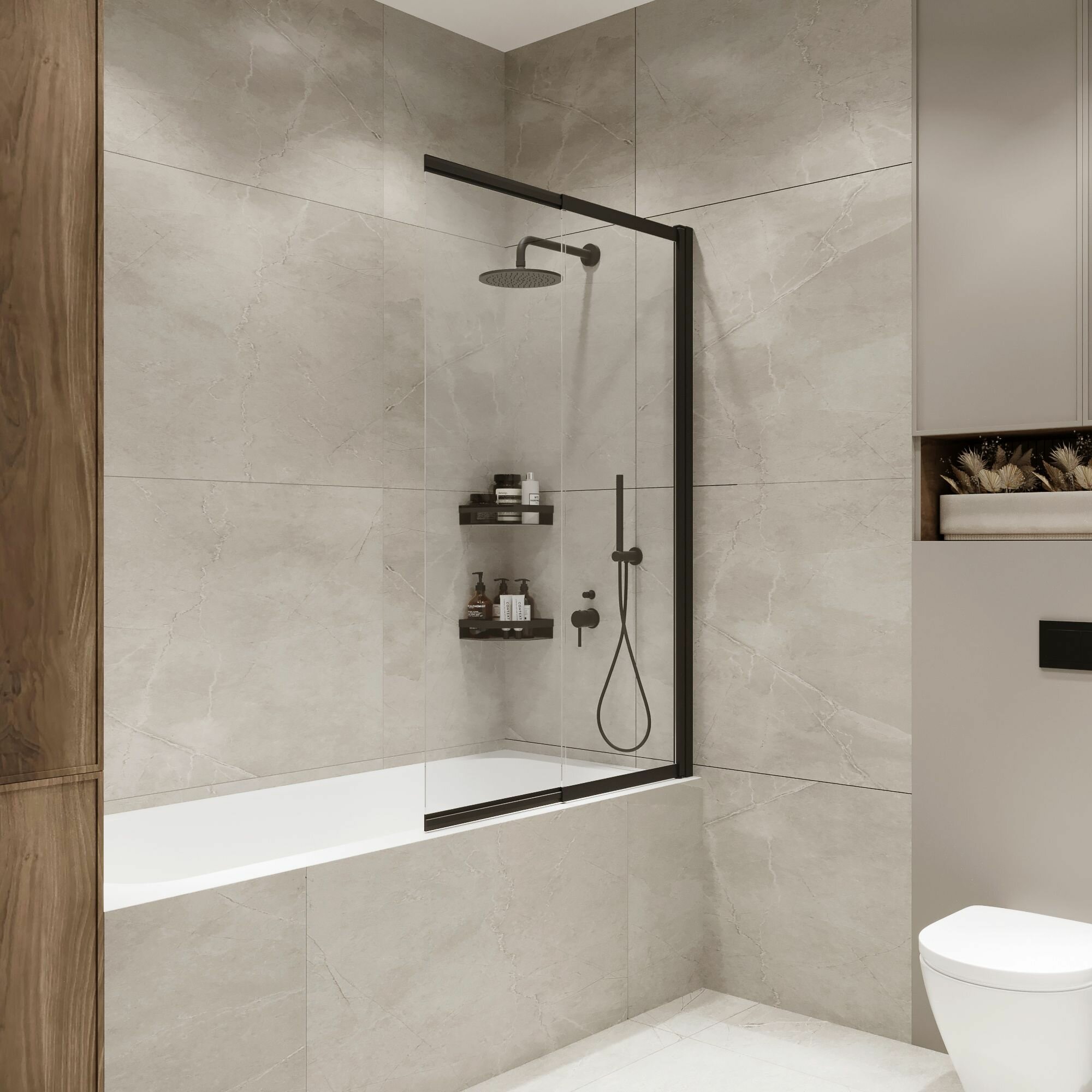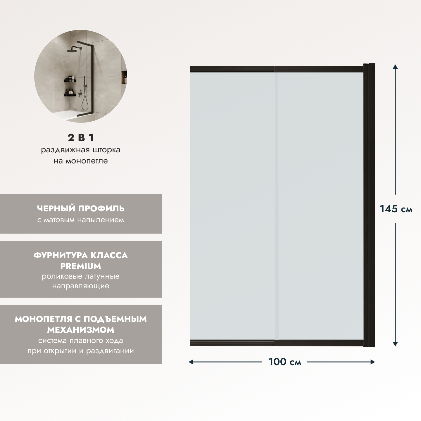 Купить Стеклянная перегородка (шторка, ширма) на борт ванны раздвижная на монопетле черный профиль прозрачное стекло