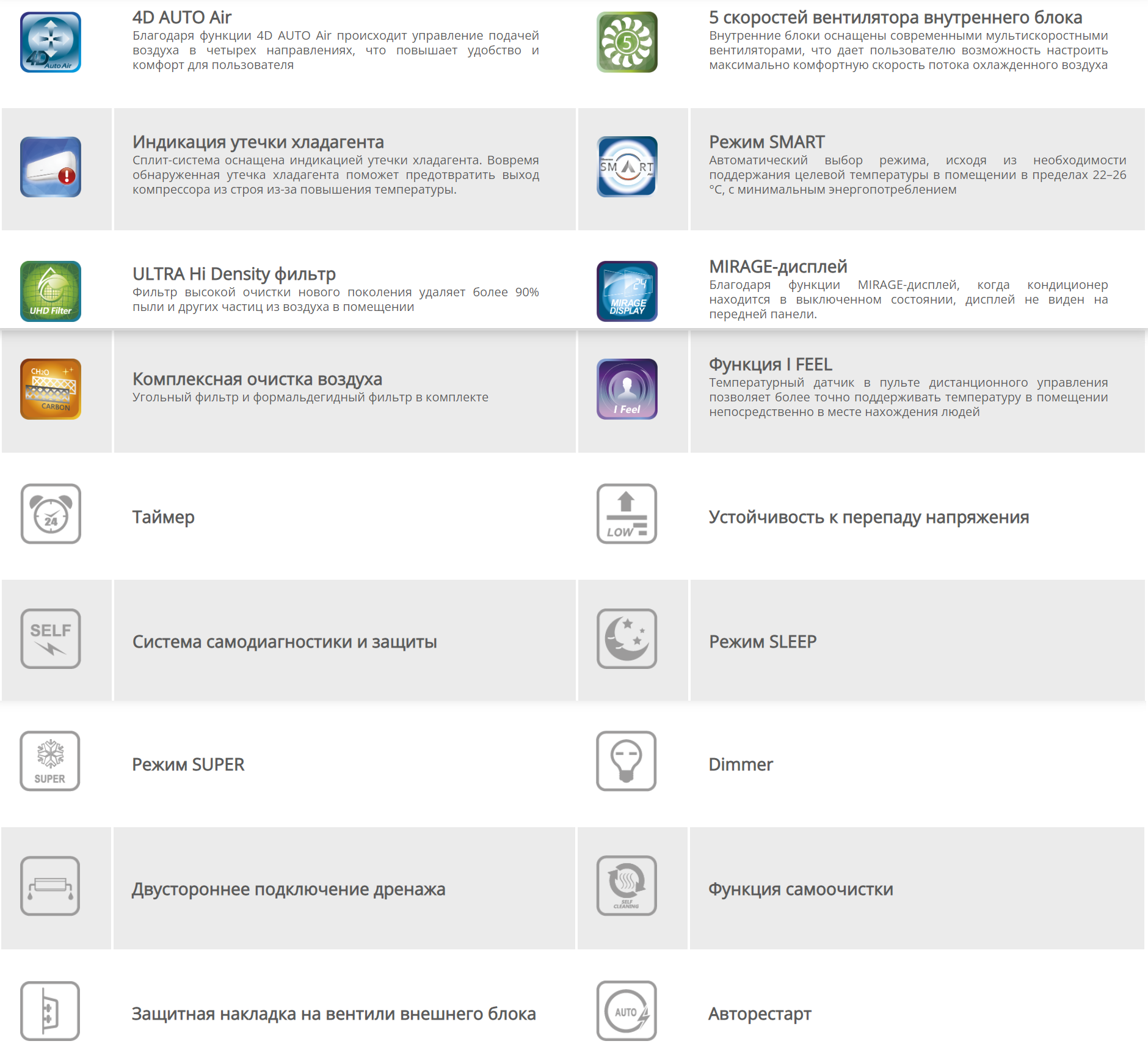 | Плюсы: | Простота в эксплуатации, экономичность, можно и согреться и охладиться очень быстро. В ночное время можно отключить подсветку,при этом кондиционер продолжит свою работу |