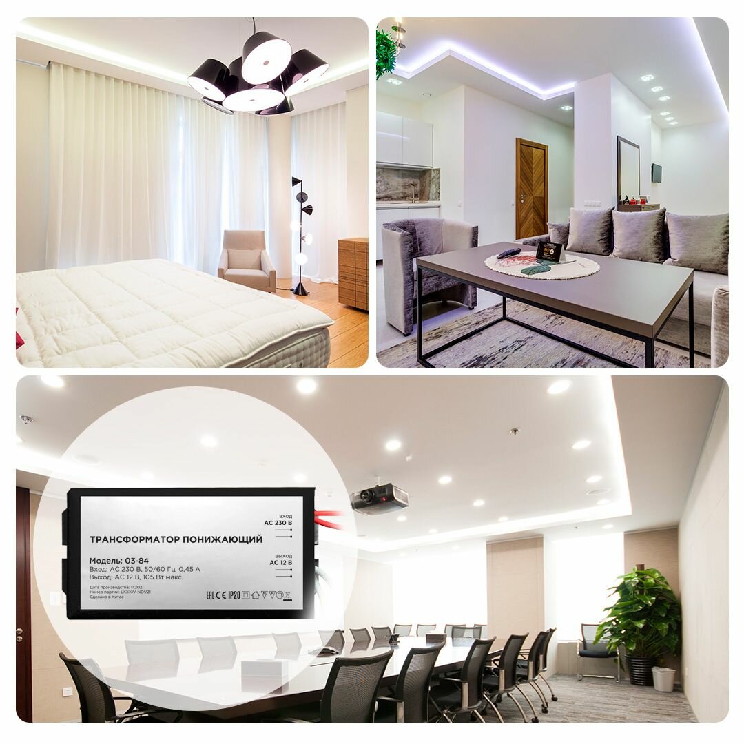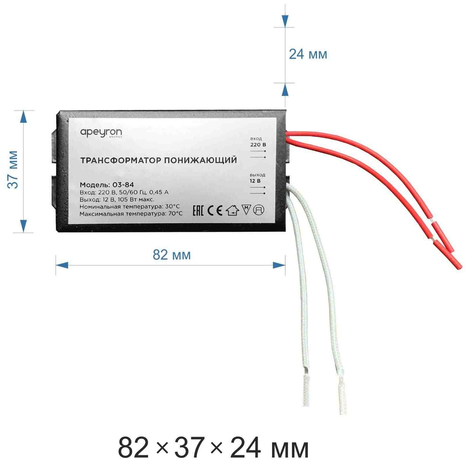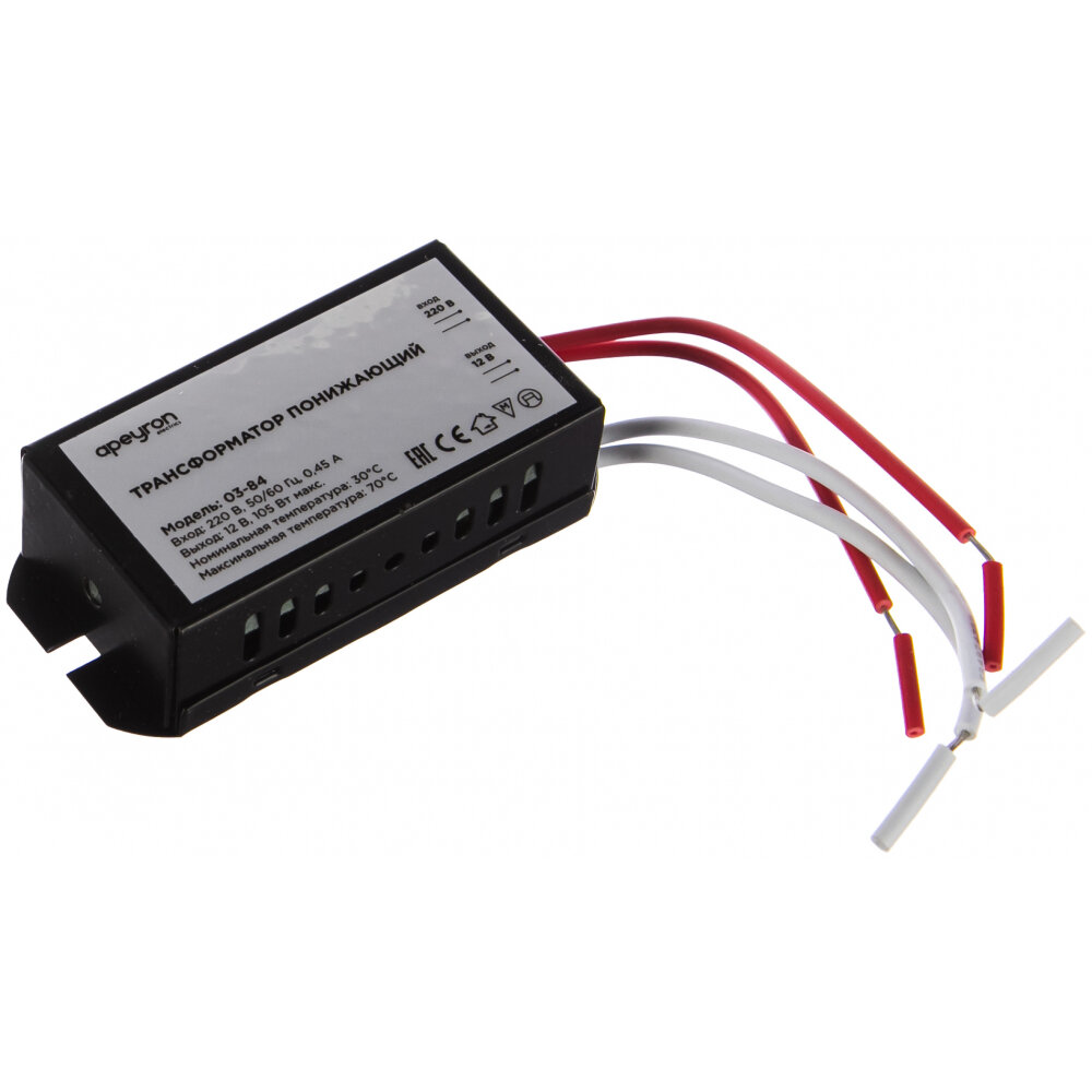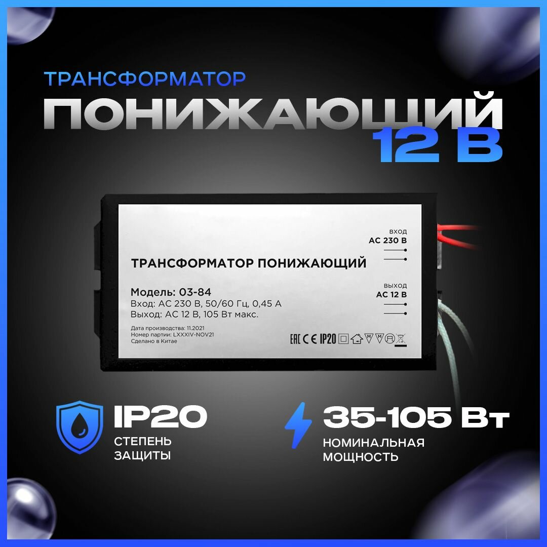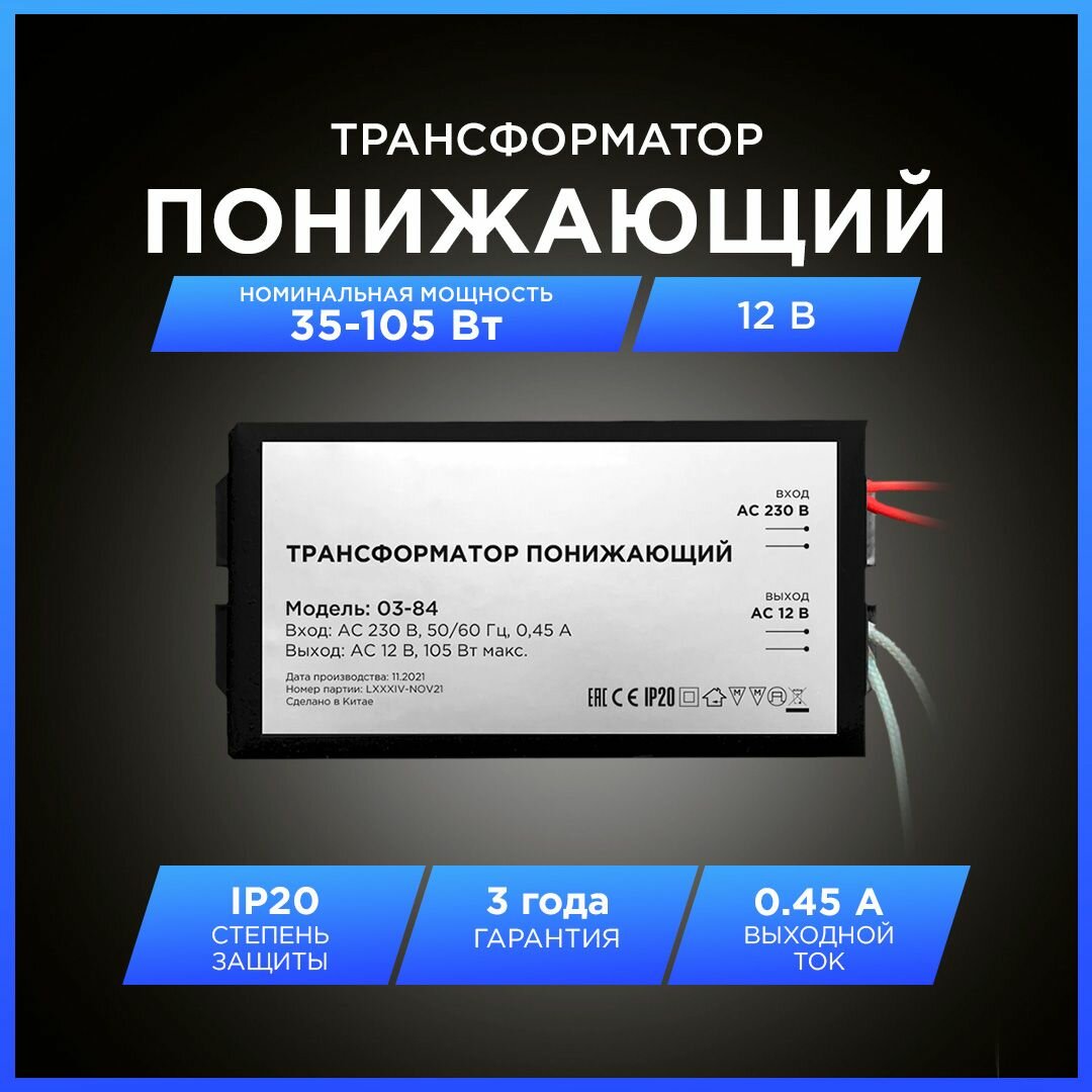 Понижающий трансформатор 03-84 для галогеновых ламп / мощность 35-105Вт / входное напряжение 220В / выходное напряжение AC 12В / влагозащита IP20 / защита от КЗ / металлический корпус черного цвета / размеры 82х37х24мм интересное: