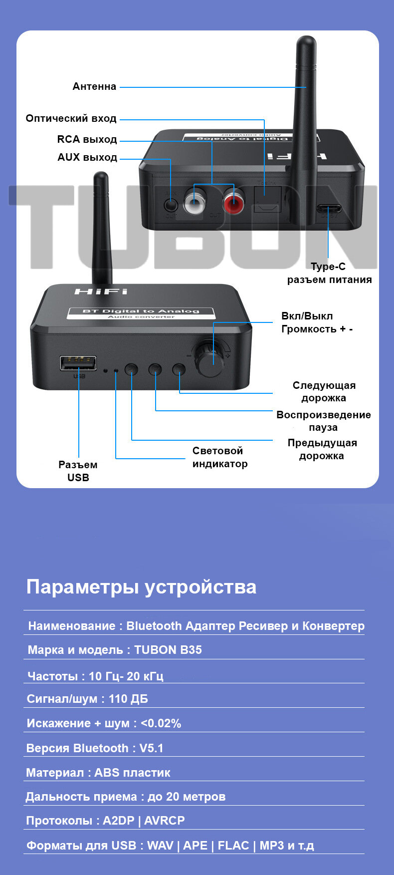Адаптер Bluetooth Ресивер (приёмник аудио) AUX, RCA, USB + DAC Аудио конвертер (Toslink - AUX, RCA ) Bluetooth 5.1 B35 интересное: