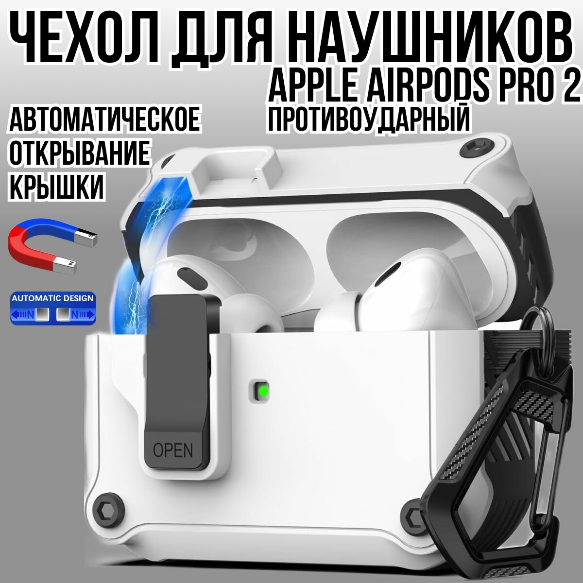 Купить Чехол для наушников Airpods Pro 2 противоударный белый / с карабином/с автооткрыванием крышки