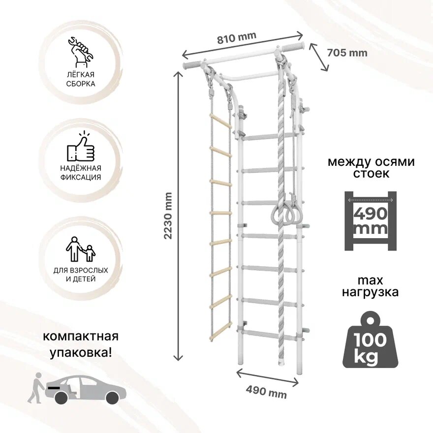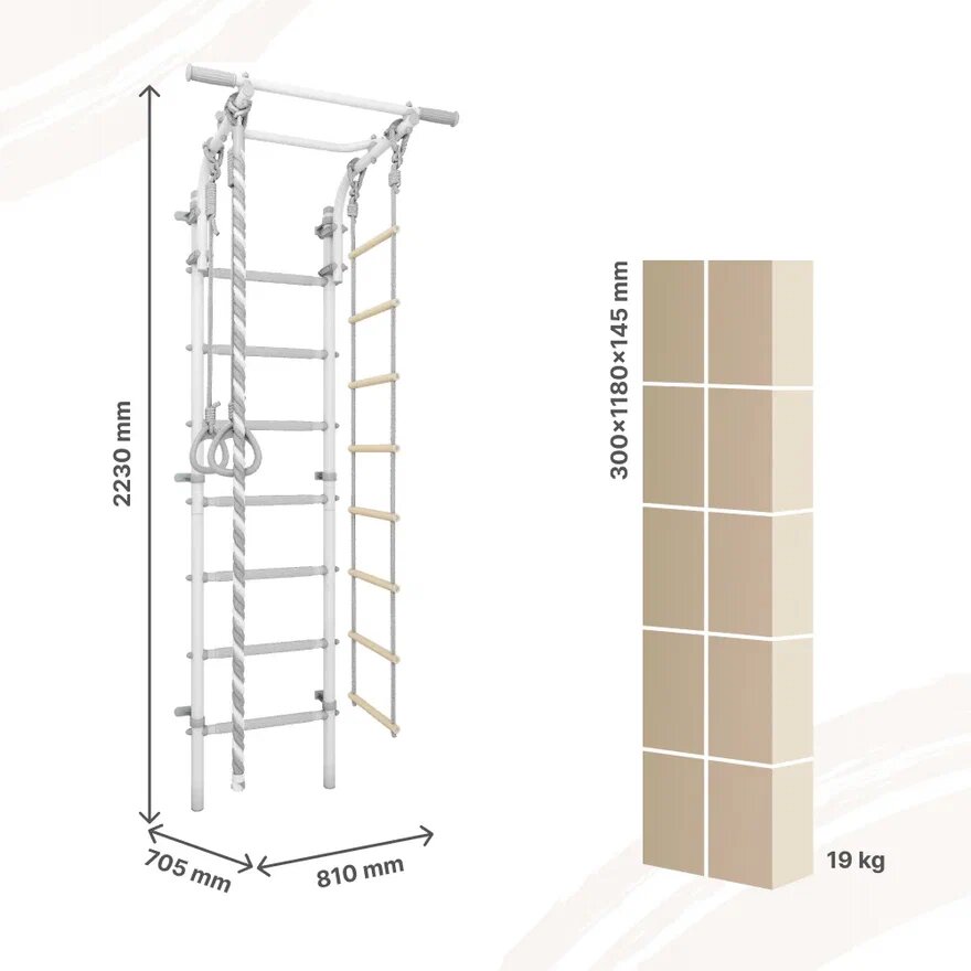 | Комплектация | гимнастические кольца / канат / качели / лестница / трапеция / турник / турник-брусья |