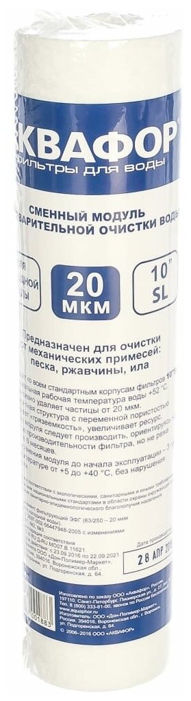 Картридж фильтра Аквафор для холодной воды ЭФГ 63/250-20С полипропиленовый от механических примесей 20 мкм 10SL 103035 АКВАФОР