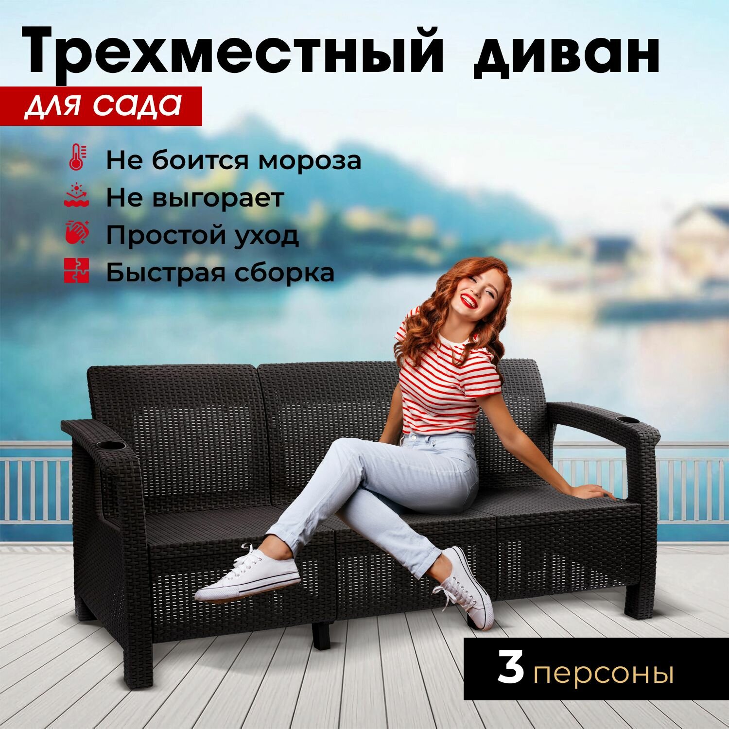 Купить Диван садовый из ротанга, 3-х местный, 188x70x79 см, мокко