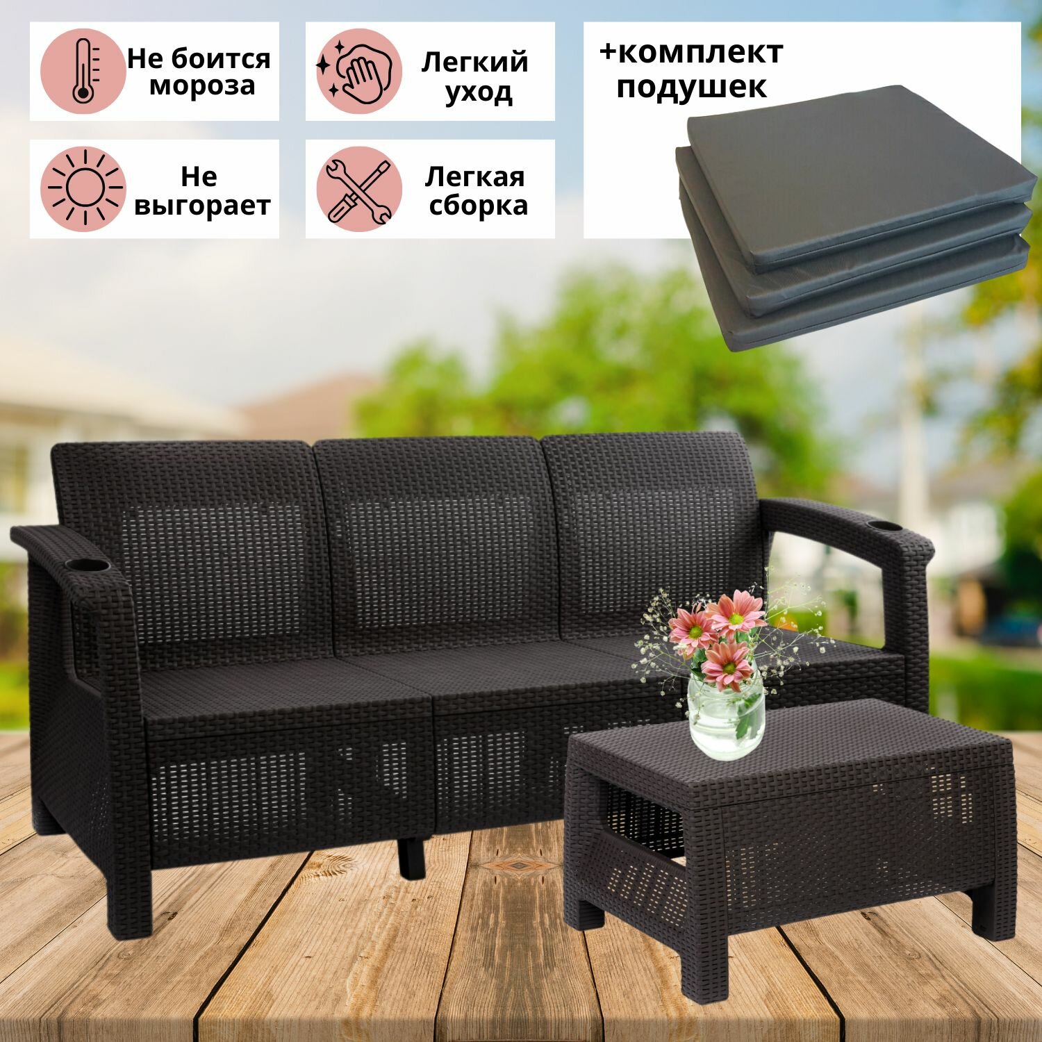 Купить Садовая мебель. 3-х местный диван и кофейный столик, мокко, серые подушки