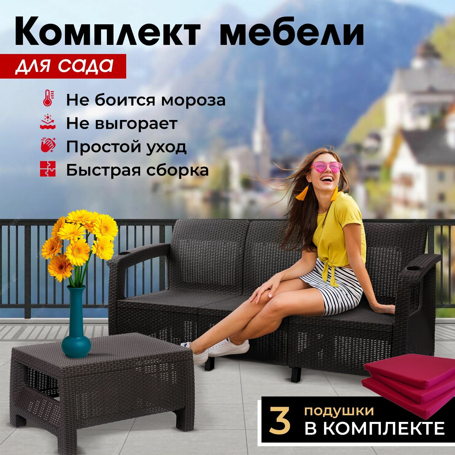 Купить Комплект садовой мебели HomlyGreen (3-х местный диван + кофейный столик), искуственный ротанг, мокко, бордовые подушки