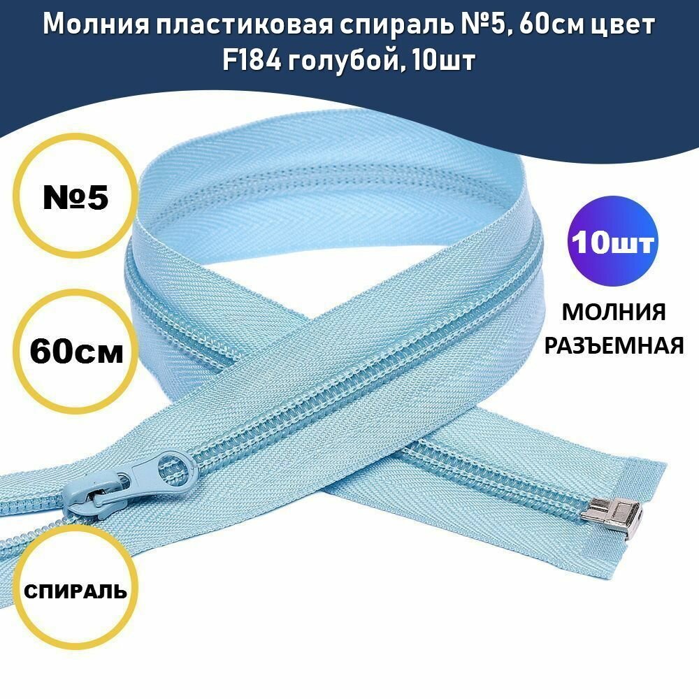 Молния MaxZipper пластиковая, Спираль, №5-N, 80 см, цвет F184, голубой, 10 шт (N-ПЛ5N.80.178.голубой)