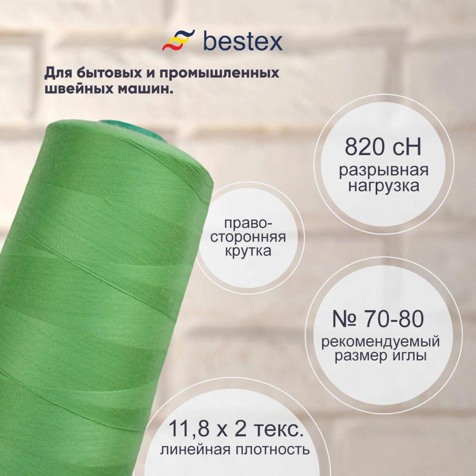 Нитки промышленные 50/2, для тонких тканей, 5000 ярдов, Bestex (128 яркий малахит)