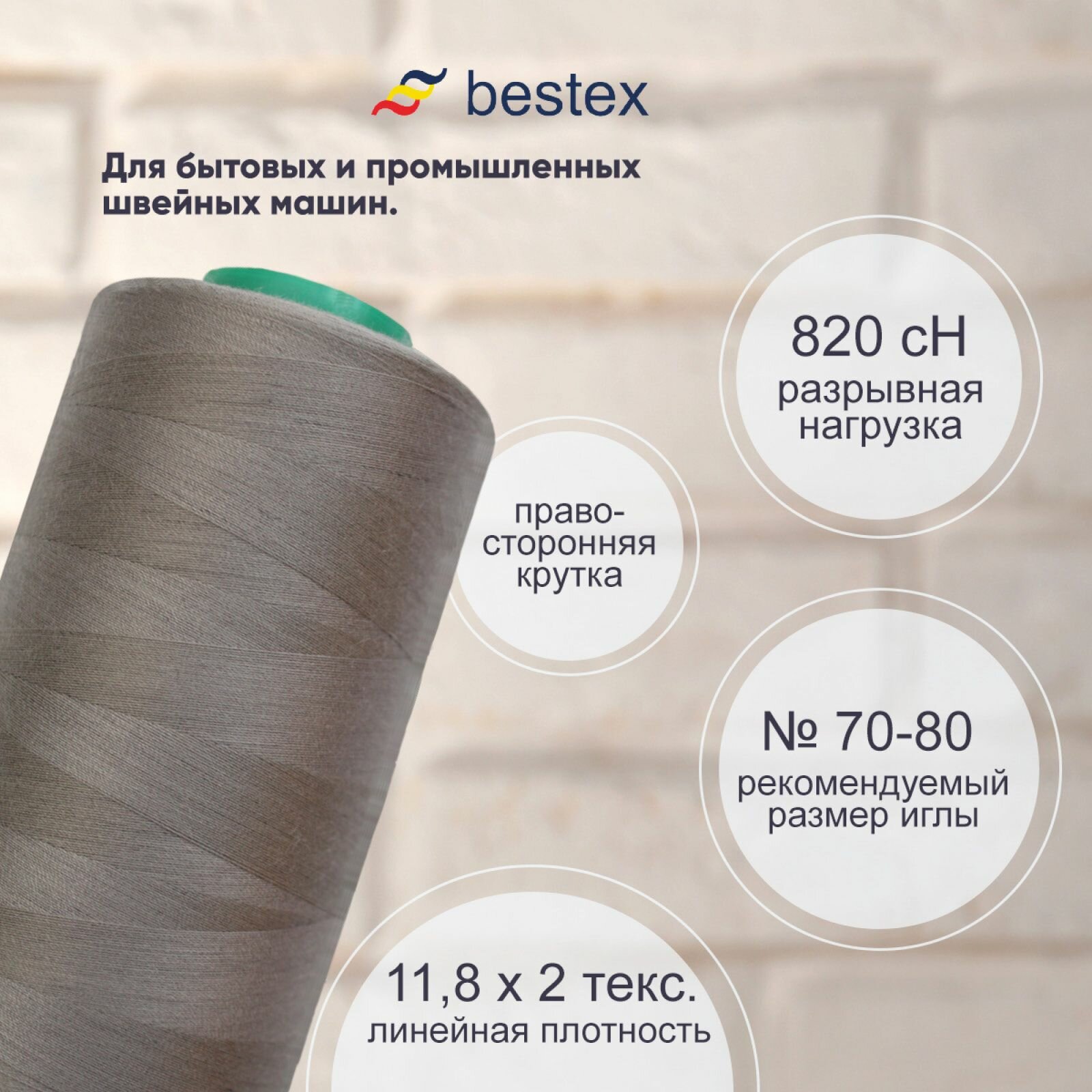 Нитки промышленные 50/2, для тонких тканей, 5000 ярдов, Bestex (231 пыльный бежевый)