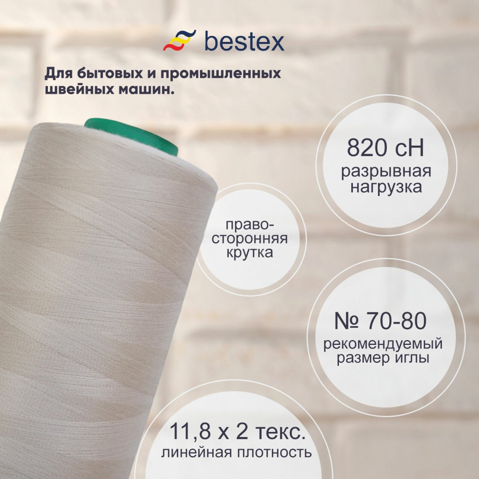 Нитки промышленные 50/2, для тонких тканей, 5000 ярдов, Bestex (202 молочно-бежевый)