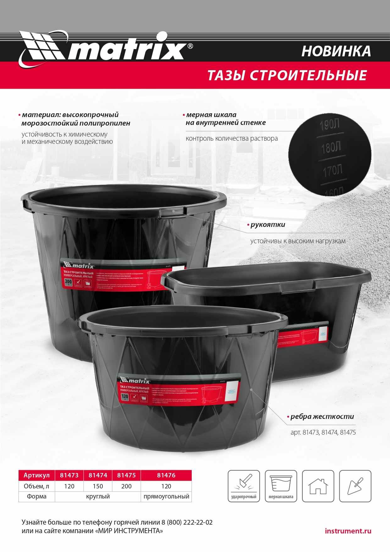 Ниже Вы можете прочитать отзывы на Таз строительный прямоугольный универсальный, 120л, ударопрочный Matrix 81476, ознакомится с подробными характеристиками, посмотреть интересные обзоры и фотографии на Таз строительный прямоугольный универсальный, 120л, ударопрочный Matrix 81476.