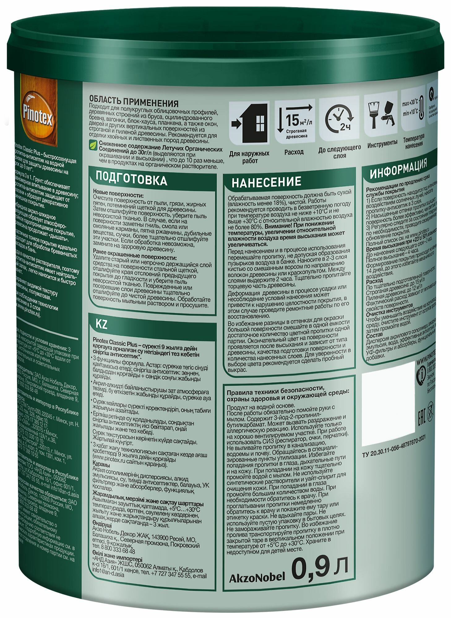 Пропитка-антисептик быстросохнущая для защиты древесины Pinotex Classic Plus, полуматовая (0,9л) бесцветный и под колеровку
