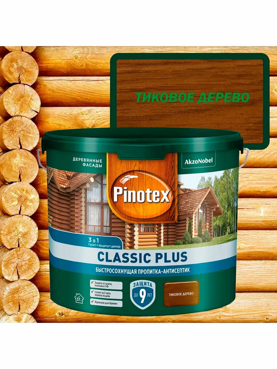 PINOTEX CLASSIC PLUS пропитка-антисептик быстросохнущая 3 в 1 тиковое дерево 9л