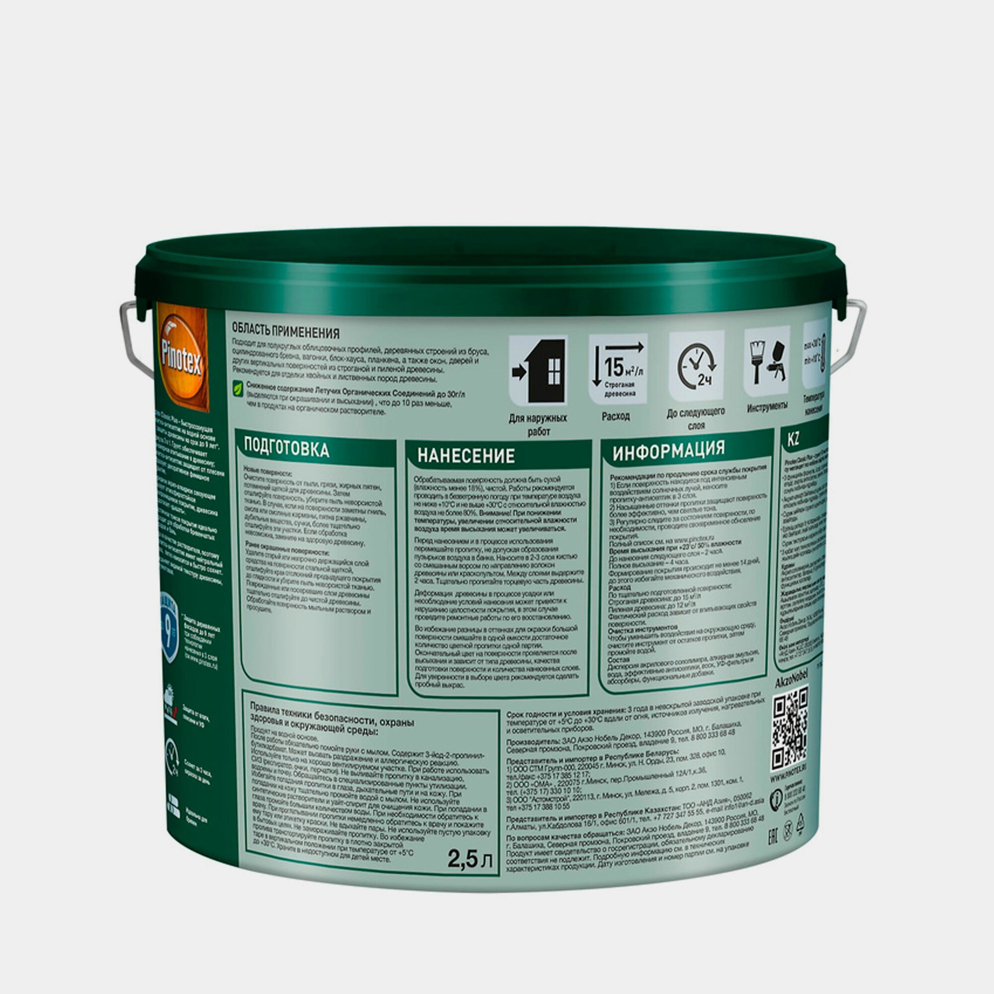 | Дополнительная информация | эксплуатацию окрашенной поверхности начинайте не ранее чем через 14 дней после окрашивания, расход на один слой: строганая древесина до 15 м²/л, пиленая древесина до 12 м²/л; упаковка товара может быть как металлическая, так и пластмассовая |