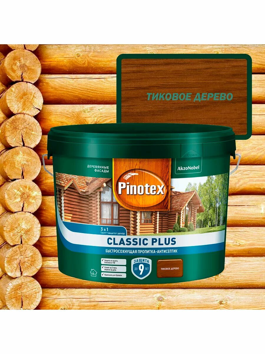 PINOTEX CLASSIC PLUS пропитка-антисептик быстросохнущая 3 в 1 тиковое дерево 9л