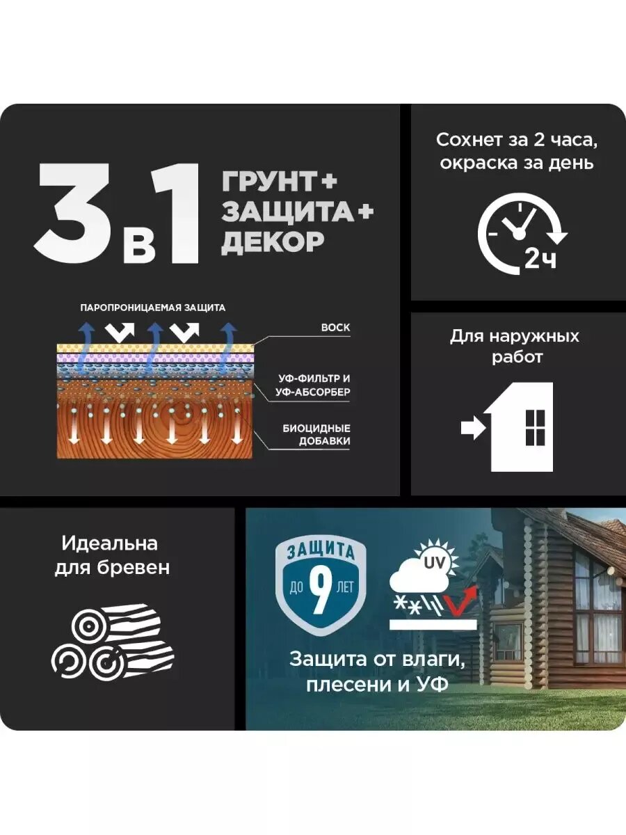 | Особенности | УФ-защита, без запаха, быстросохнущая, водозащитная, декоративная, для использования в бане/сауне, с антисептиком |