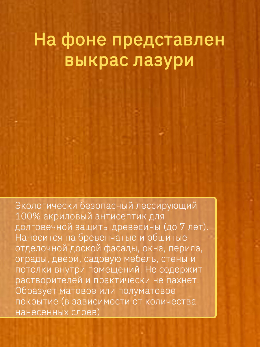 | Дополнительная информация | сделана на 100% акриловом связующем; наносится на поверхность строганой и пиленой древесины; сохраняет видимой текстуру и подчеркивает рисунок натуральной древесины; образует матовое или полуматовое покрытие (в зависимости от количества нанесенных слоев); обеспечивает защиту древесины до 7 лет. |
