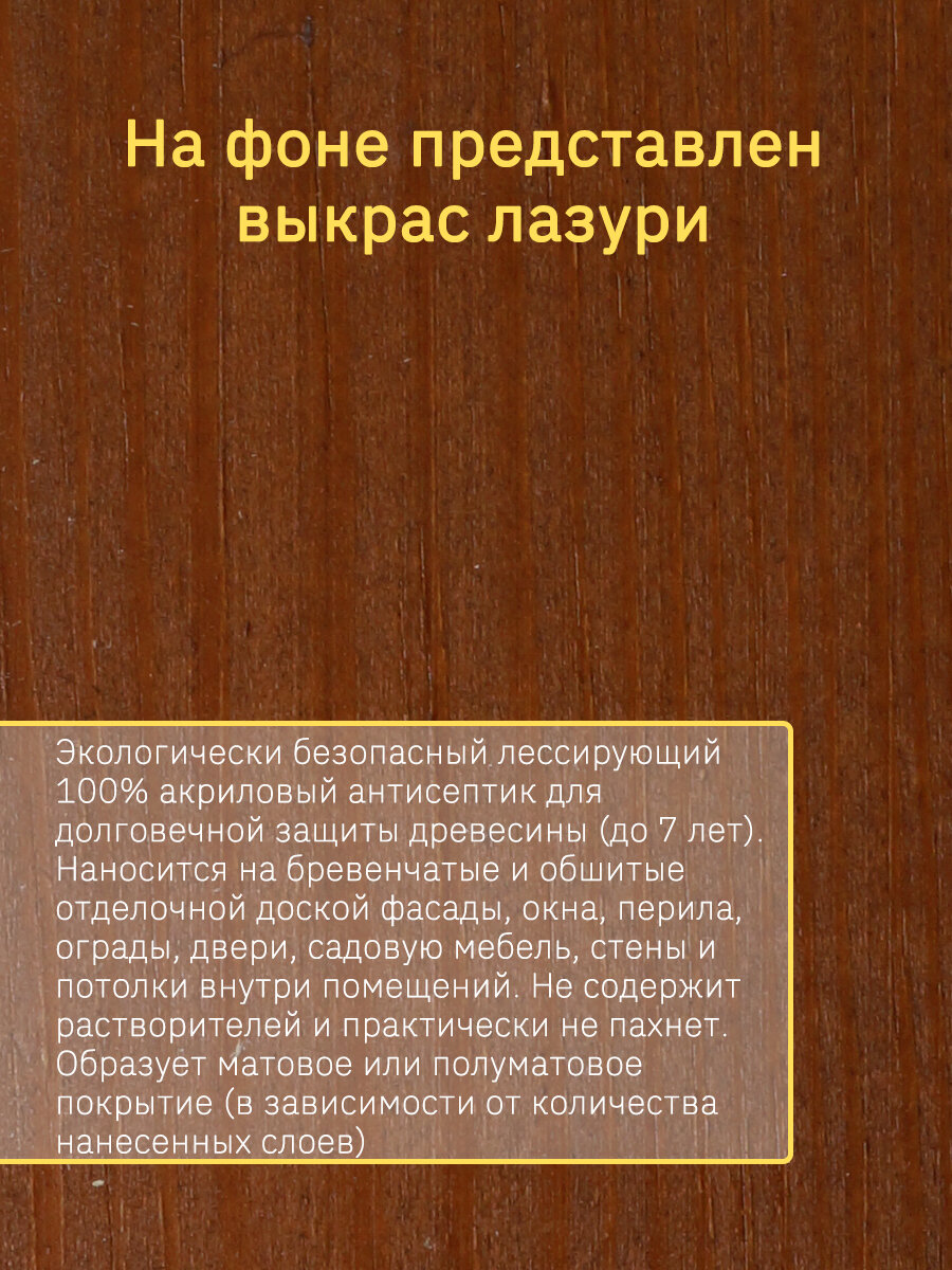 | Дополнительная информация | сделана на 100% акриловом связующем; наносится на поверхность строганой и пиленой древесины; сохраняет видимой текстуру и подчеркивает рисунок натуральной древесины; образует матовое или полуматовое покрытие (в зависимости от количества нанесенных слоев); обеспечивает защиту древесины до 7 лет. |