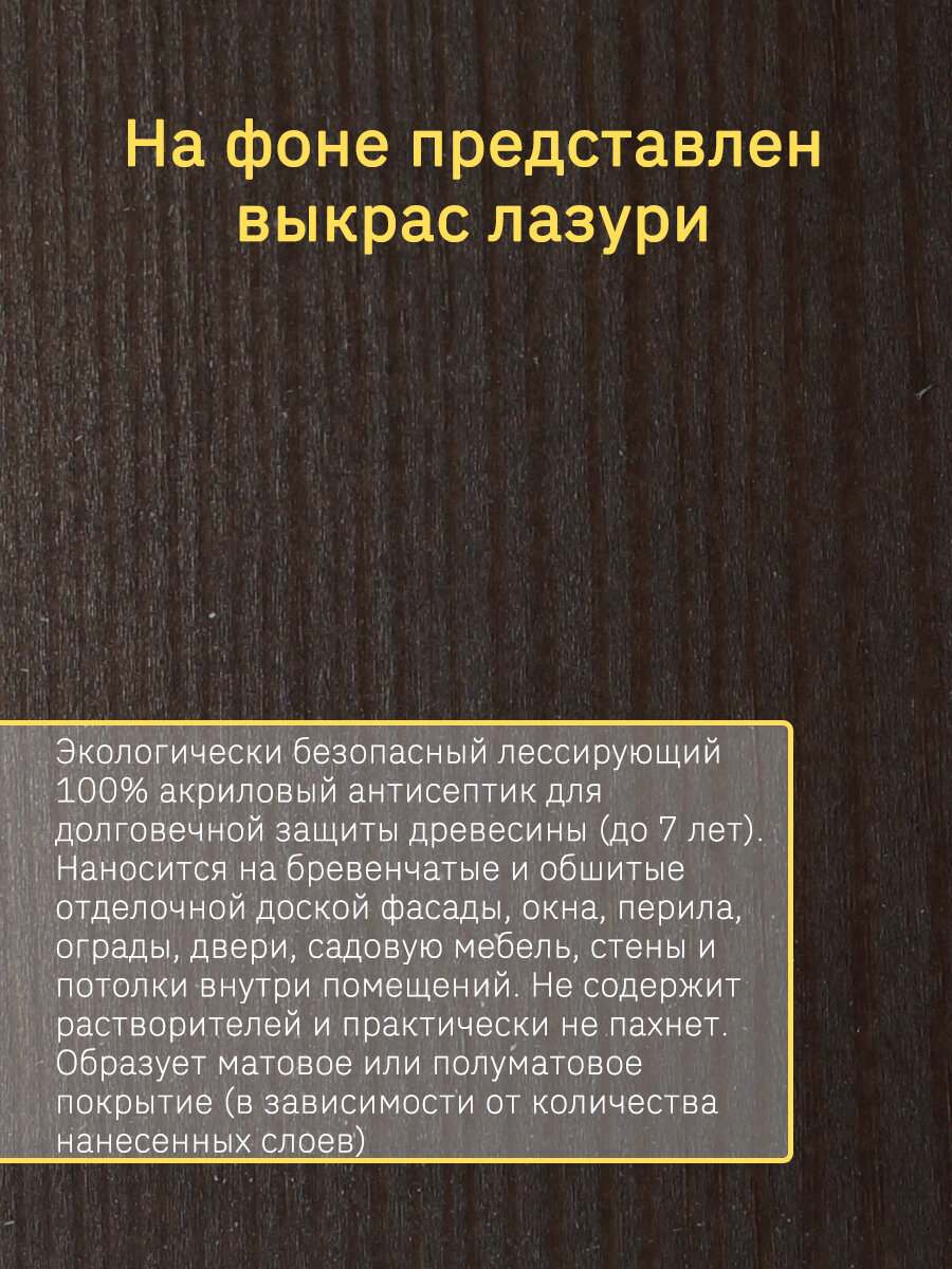 | Дополнительная информация | сделана на 100% акриловом связующем; наносится на поверхность строганой и пиленой древесины; сохраняет видимой текстуру и подчеркивает рисунок натуральной древесины; образует матовое или полуматовое покрытие (в зависимости от количества нанесенных слоев); обеспечивает защиту древесины до 7 лет. |