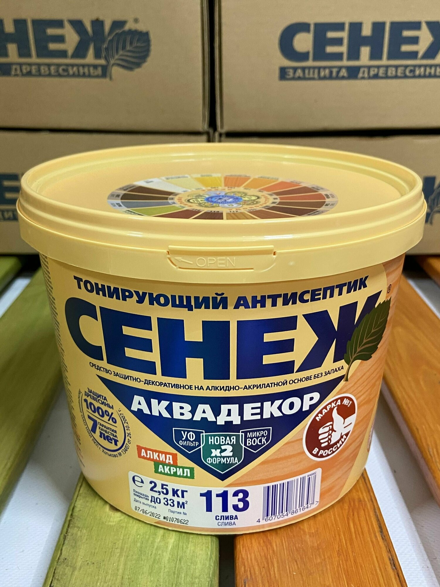 Сенеж аквадекор. Цвет 113 Слива. Тонирующий антисептик на алкидно-акрилатной основе с УФ фильтром и воском для долговременной защиты и отделки древесины. Ведро массой нетто 2,5 кг.