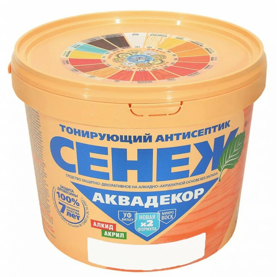 Сенеж аквадекор. Цвет 101 Иней. Тонирующий антисептик на алкидно-акрилатной основе с УФ фильтром и воском для долговременной защиты и отделки древесины. Ведро массой нетто 2,5 кг.