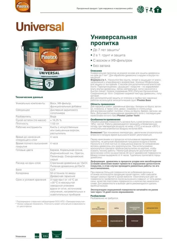 Универсальная пропитка на водной основе 2в1 для древесины Pinotex Universal полуматовая (2,5л) бесцветный и под колеровку