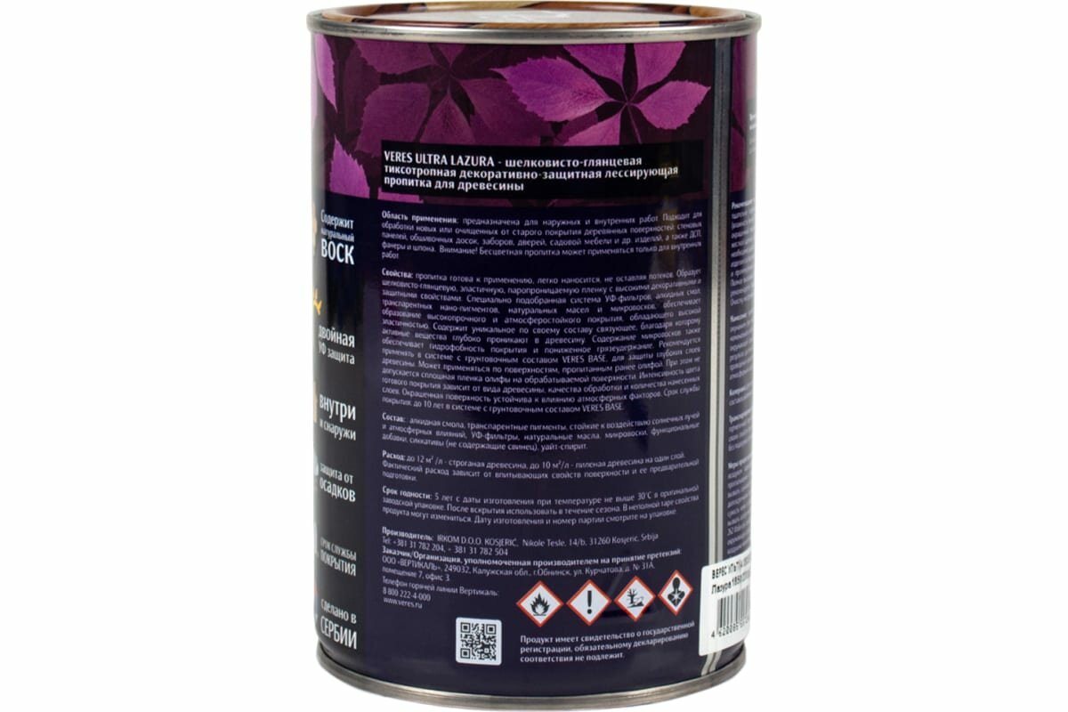 | Дополнительная информация | расход: пиленая древесина на один слой до 10 м2/литр, строганая древесина на один слой до 12 м2/литр; время высыхания до нанесения следующего слоя: 6 ч |