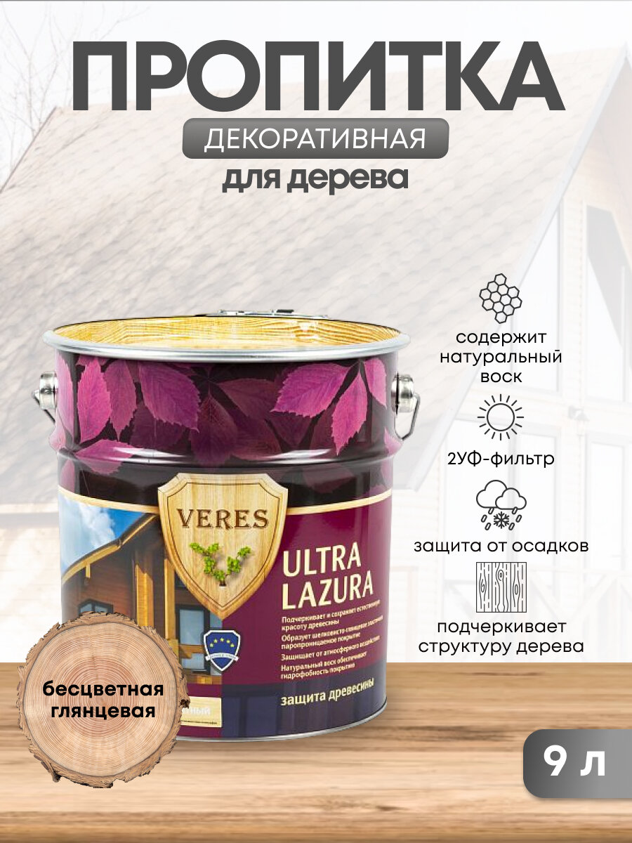 Декоративная пропитка для дерева Veres Ultra Lazura №1, глянцевая, 9 л, бесцветная