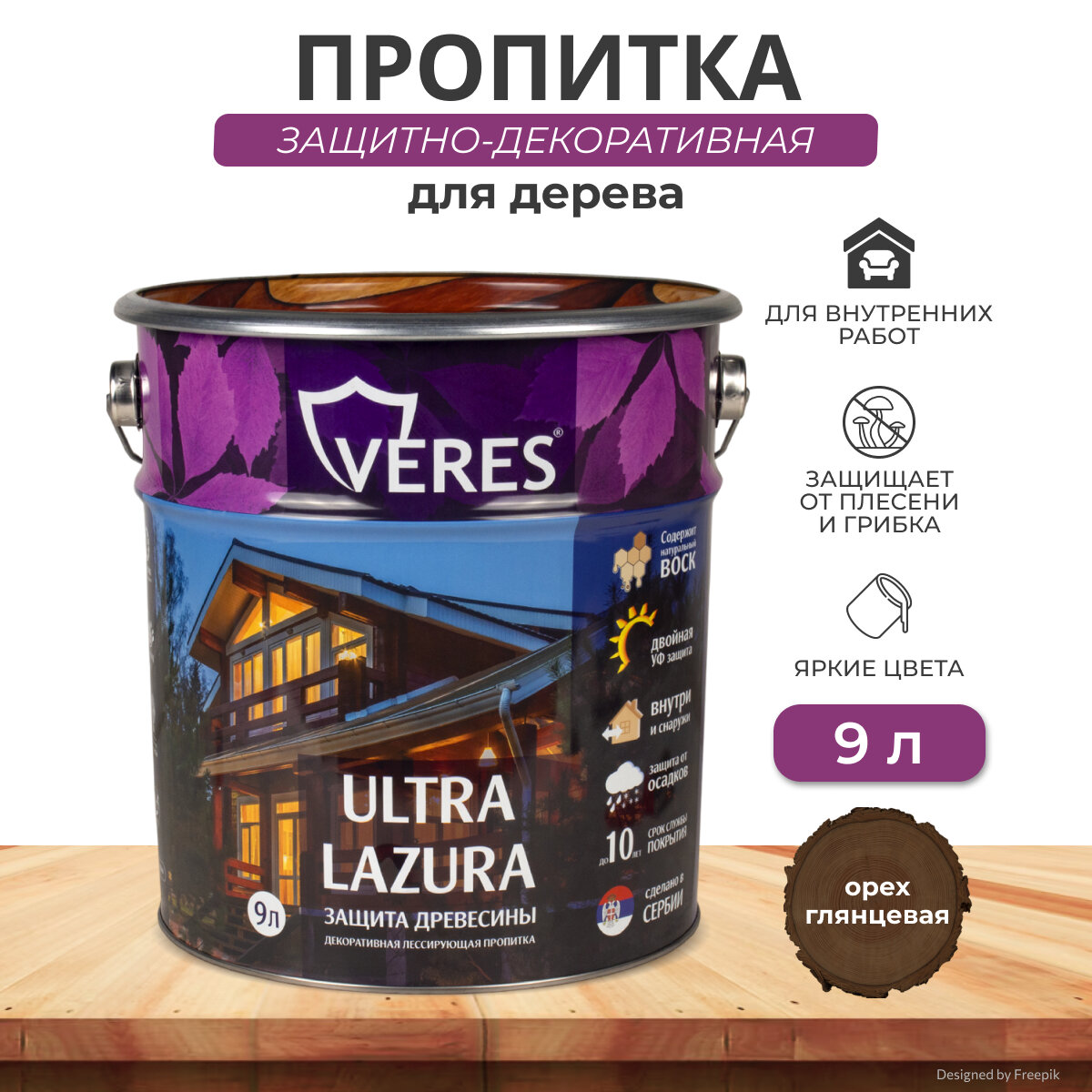 Купить Декоративная пропитка для дерева Veres Ultra Lazura №4, глянцевая, 9 л, орех
