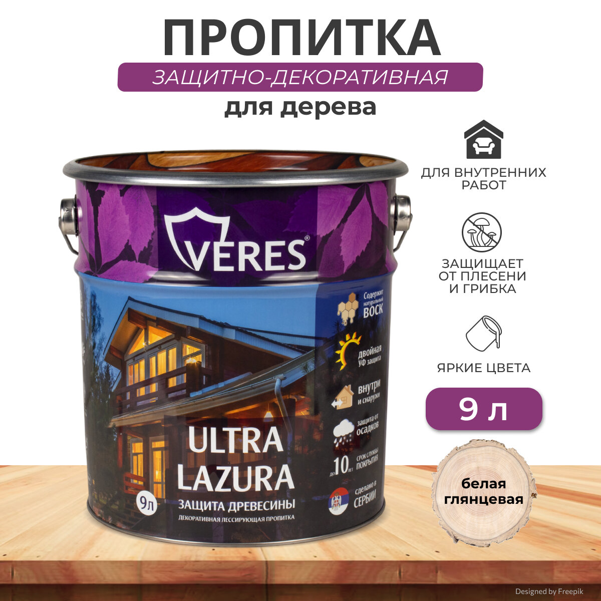 Купить Декоративная пропитка для дерева Veres Ultra Lazura №12, глянцевая, 9 л, белая