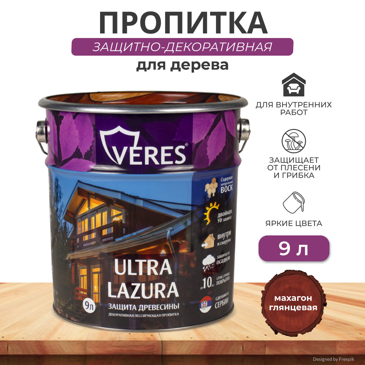 Декоративная пропитка для дерева Veres Ultra Lazura №9, глянцевая, 9 л, палисандр