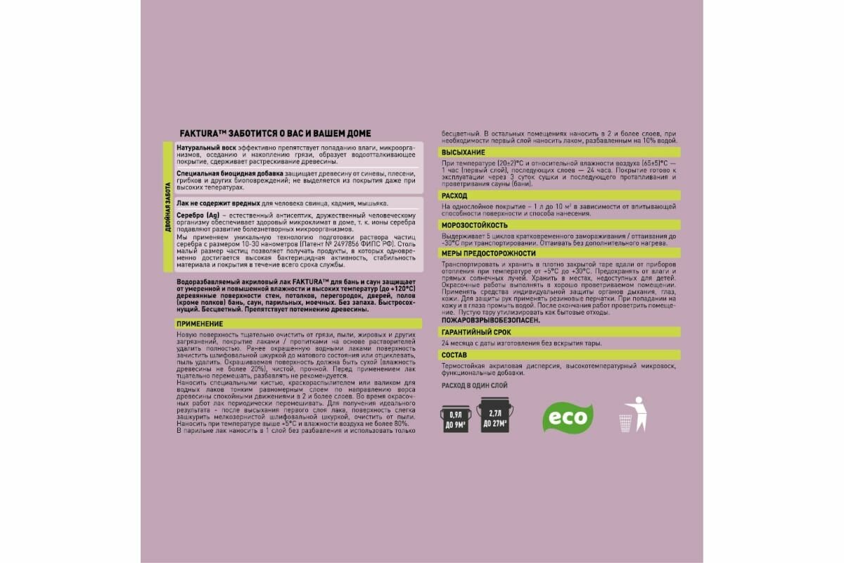Faktura лак для бань и саун термостойкий до 120С с ионами серебра и натуральным воском 2,7л О02540 .