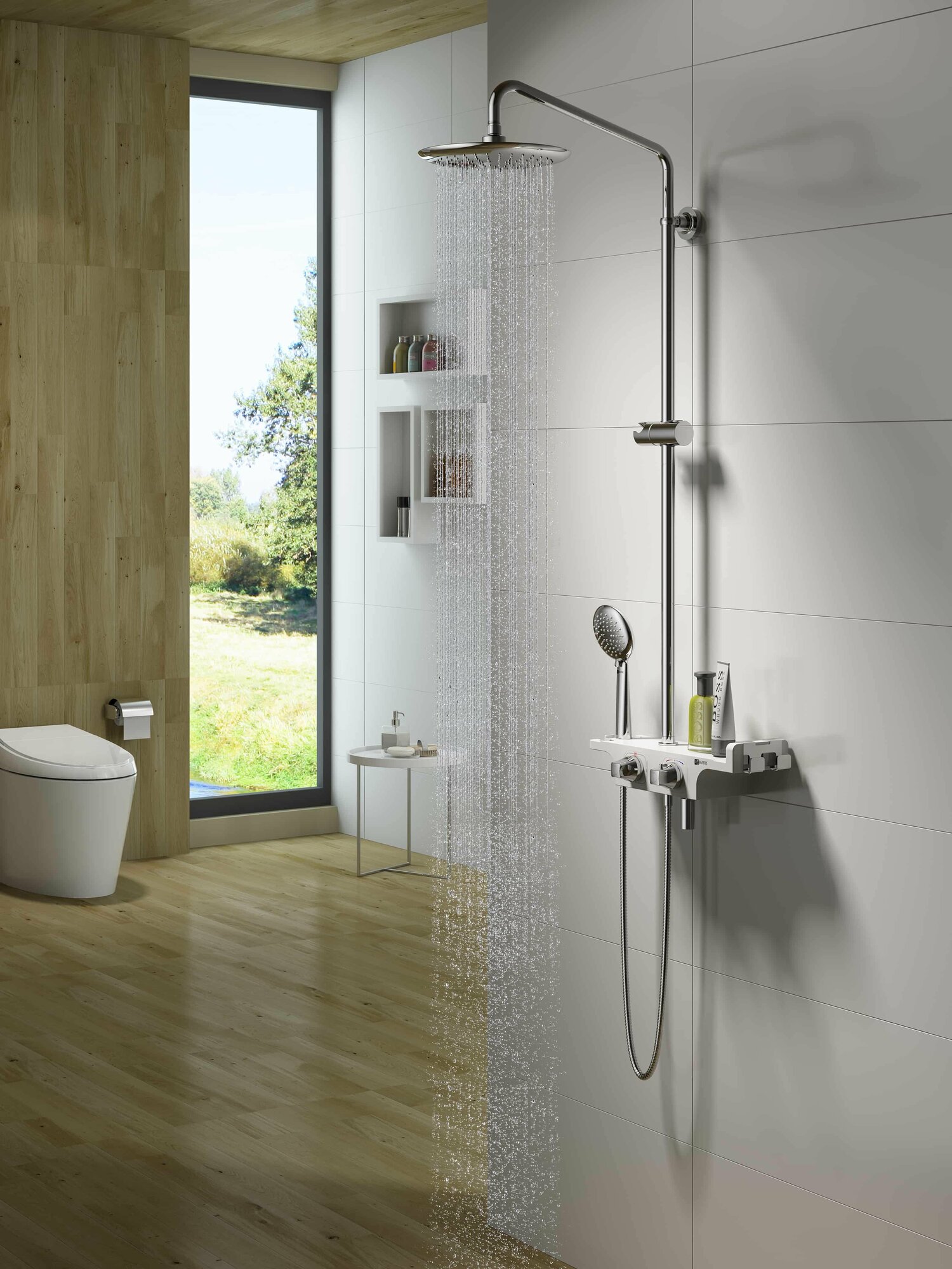 | Дополнительная информация | растягивающийся шланг; покрытие хром/белый; высота стойки для душа: 1845 мм; диаметр душевой лейки: 110 мм; диаметр верхнего душа: 250 мм |