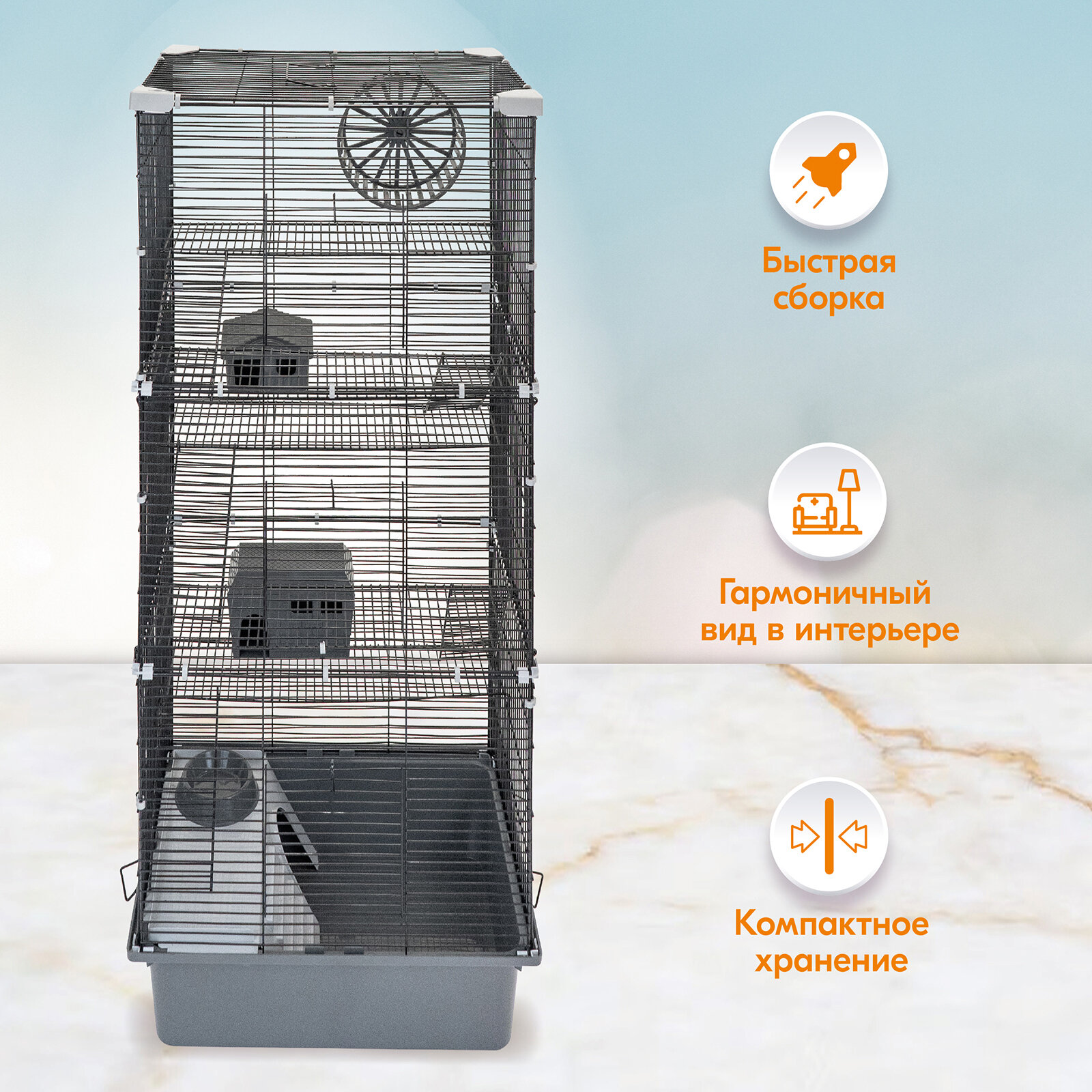 Клетка для грызунов "PetTails" разборная, шаг прута 10,5мм, 42*30*h89см, 5 этажей (+полка-домик, колесо, миска, 2 пласт. домика) серая