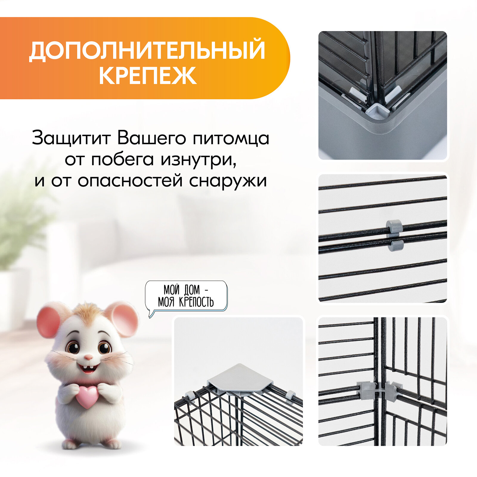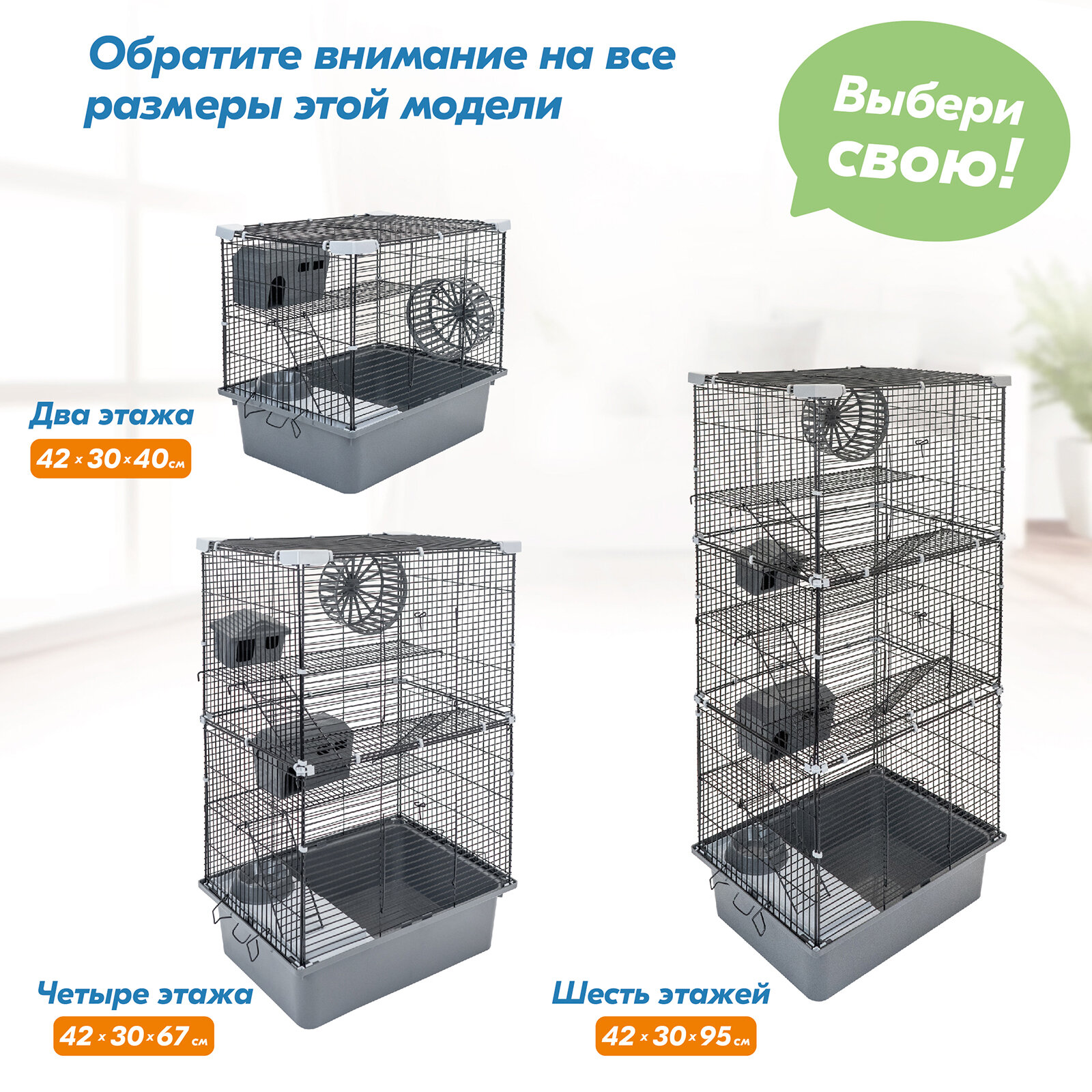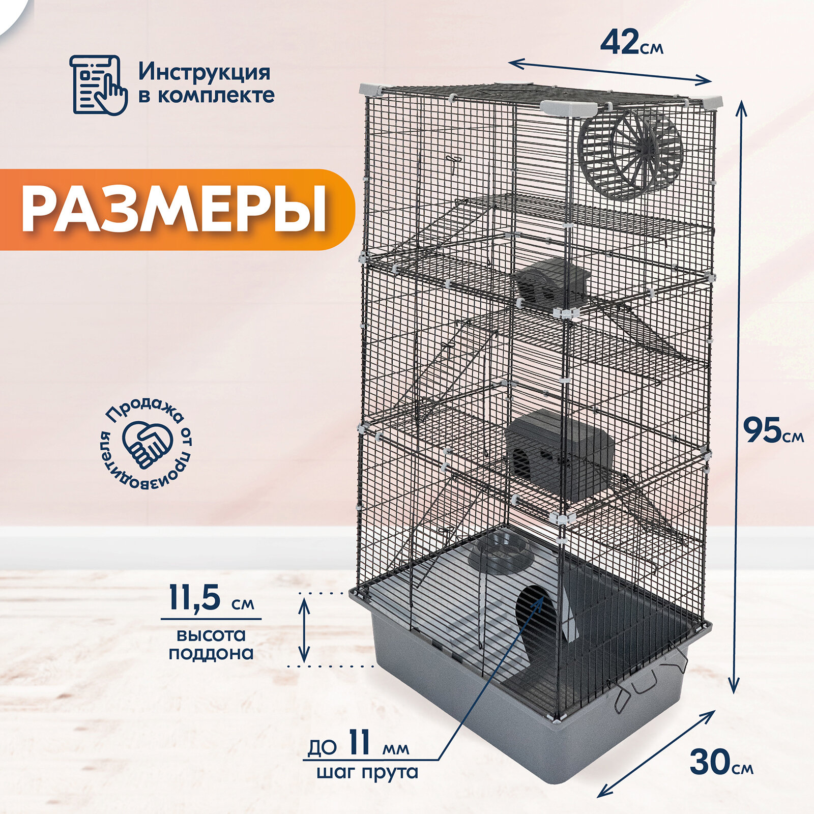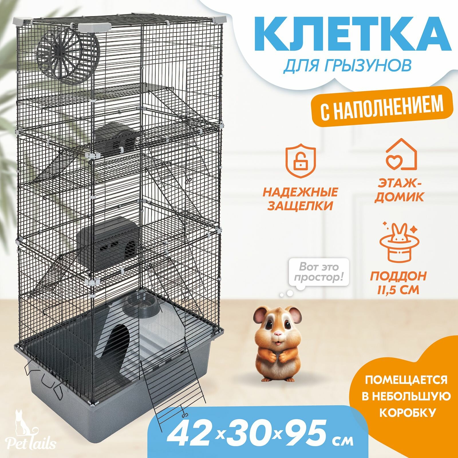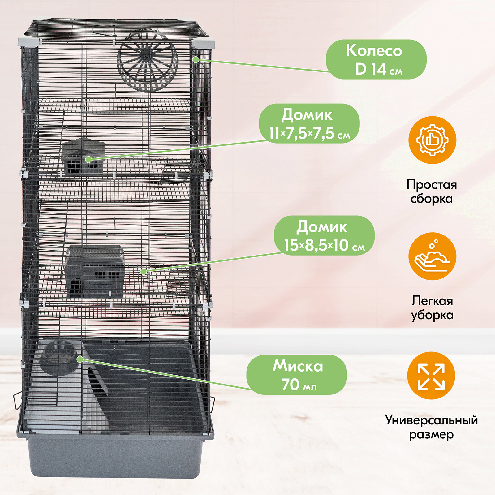 Купить Клетка для грызунов "PetTails" разборная, шаг прута 10,5мм, 42*30*h95см, 5 этажей (+полка-домик, колесо, миска, 2 пласт. домика) серая
