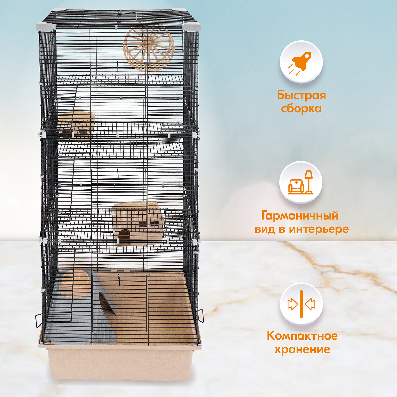 Клетка для грызунов "PetTails" разборная, шаг прута 10,5мм, 42*30*h89см, 5 этажей (+полка-домик, колесо, миска, 2 пласт. домика) бежевая