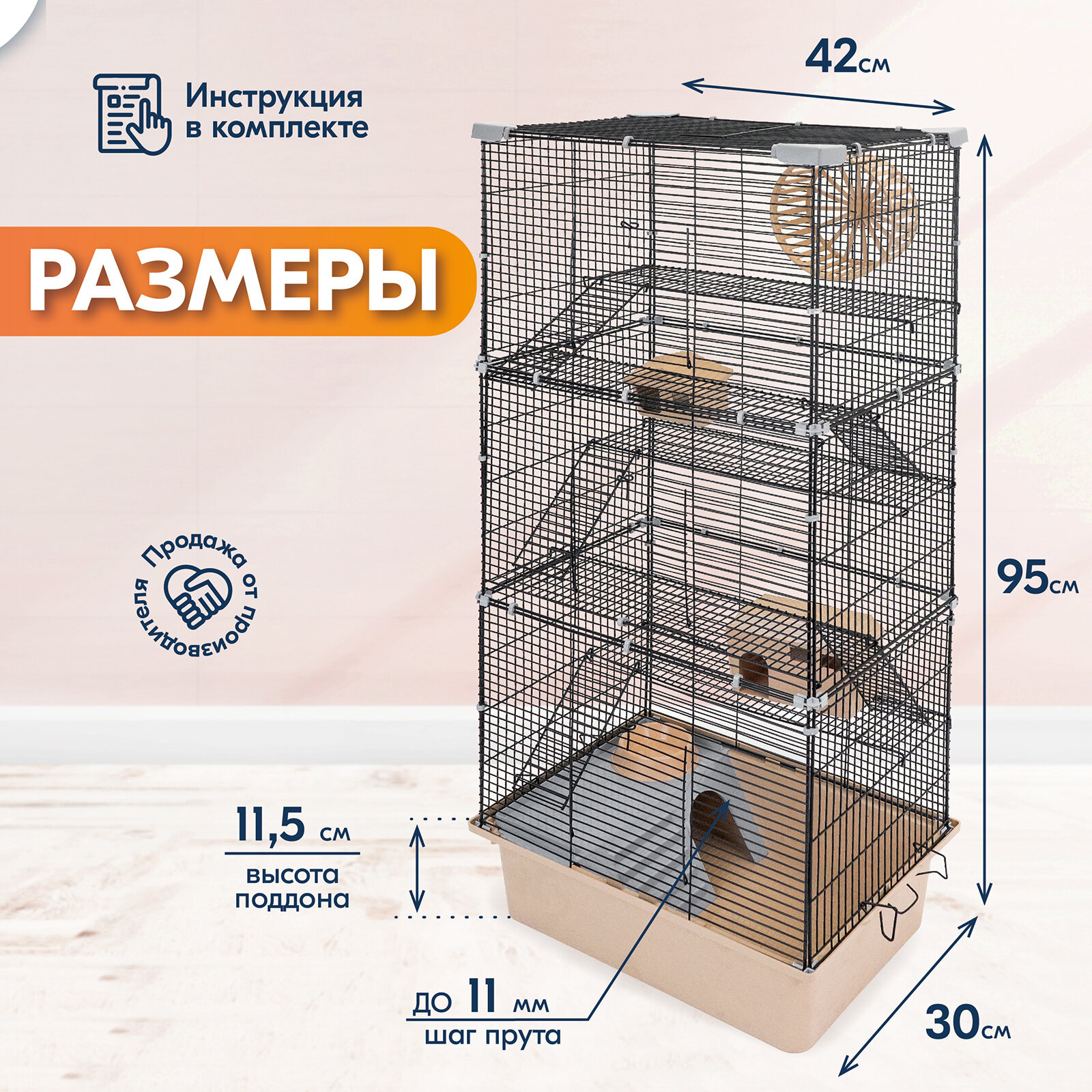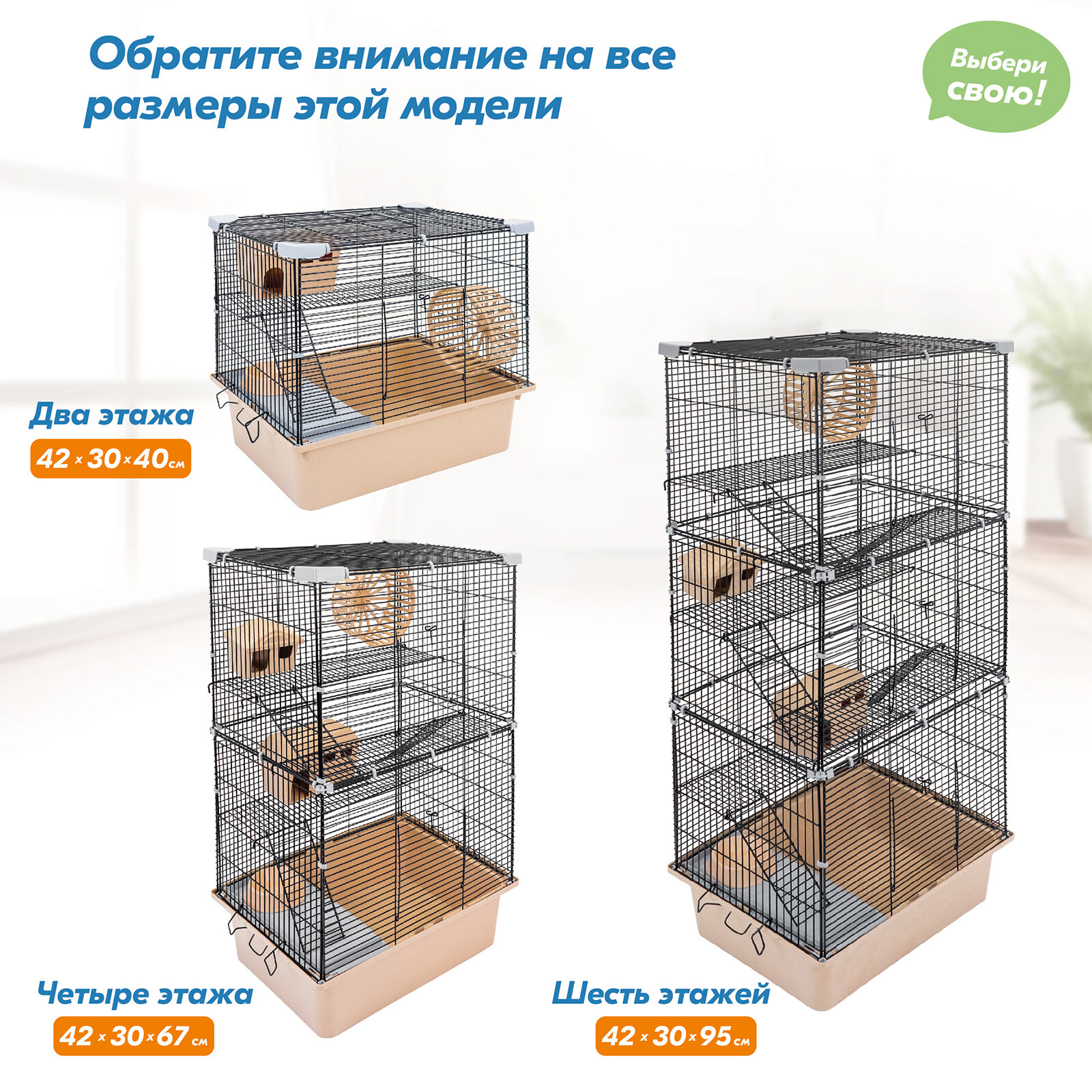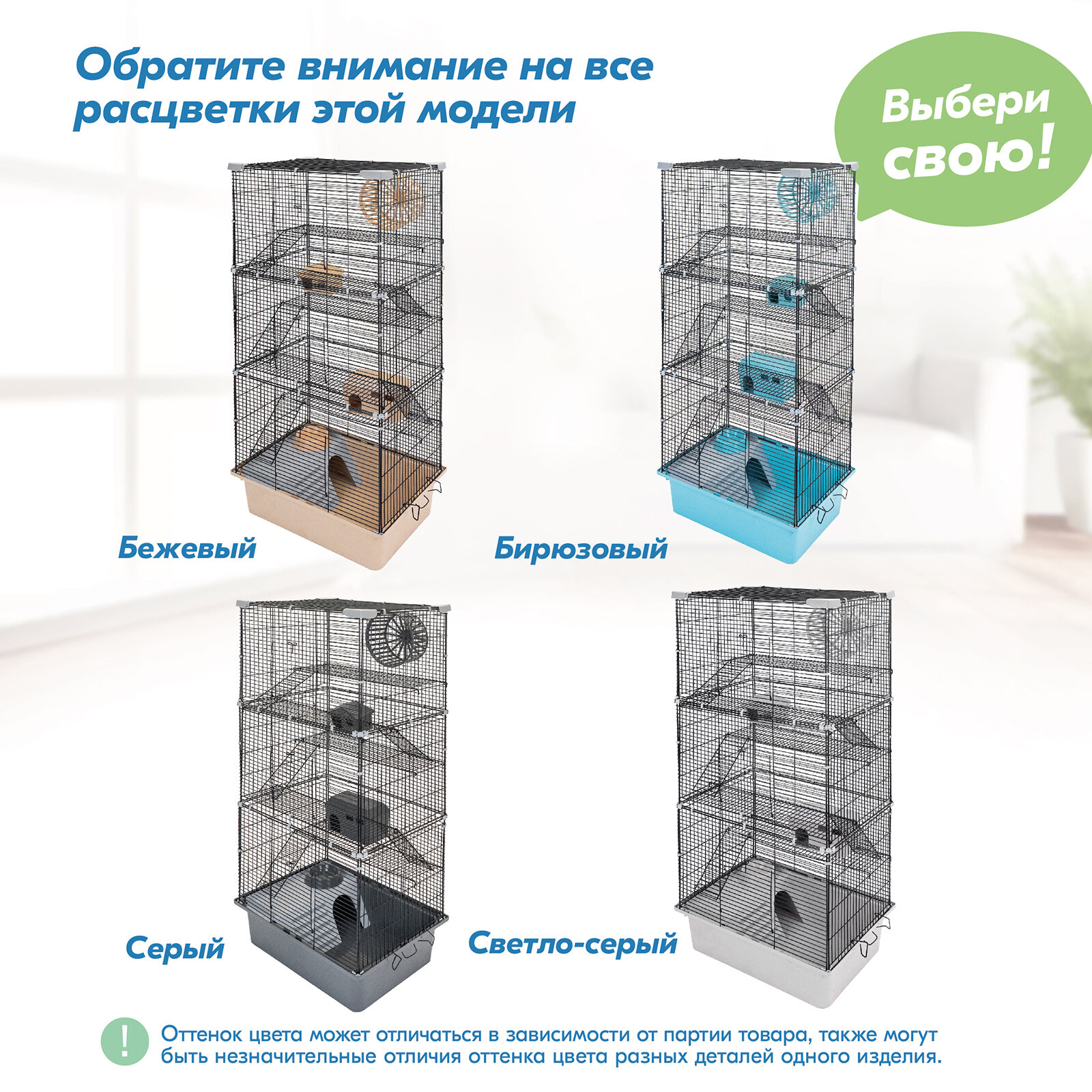 Купить Клетка для грызунов "PetTails" разборная, шаг прута 10,5мм, 42*30*h95см, 5 этажей (+полка-домик, колесо, миска, 2 пласт. домика) бежевая