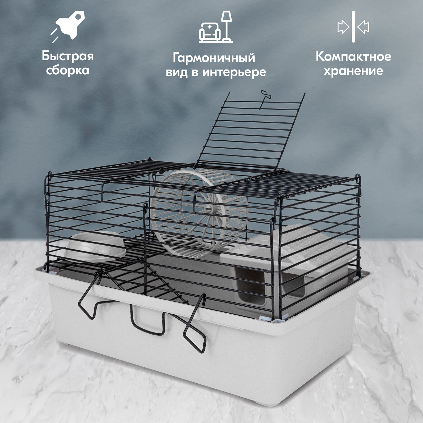 Купить Клетка-мини д/мелких грызунов "PetTails", складная, шаг прута до 9,5мм, 28*17*h20см (+домик, миска, колесо) светло-серая