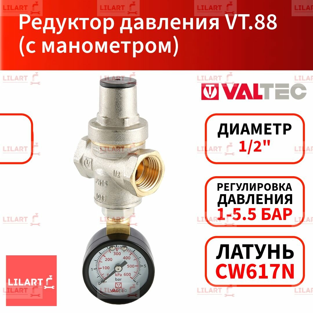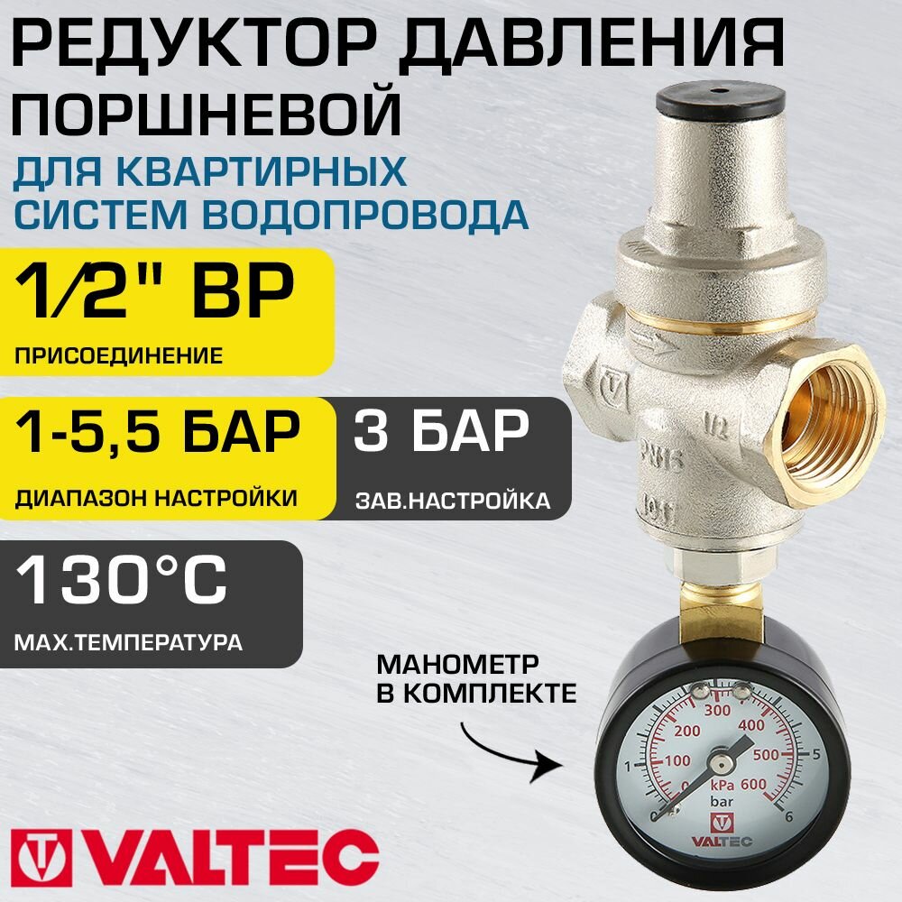 Редуктор давления VALTEC с манометром поршневой от 0,5 до 5,5 бар. 1/2" VT.088. N.0455 интересное: