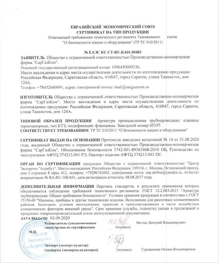 Клапан термозапорный газовый КТЗ 20-0,6 (В-Н) муфтовый интересное: