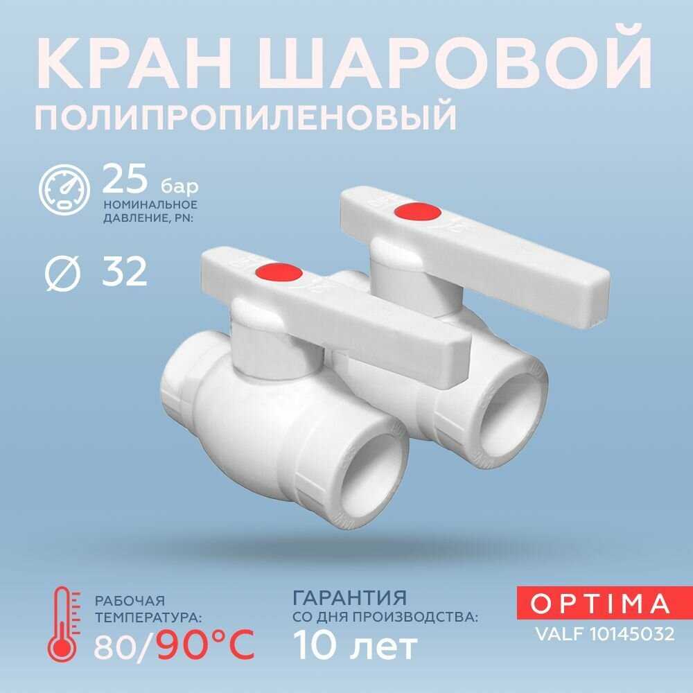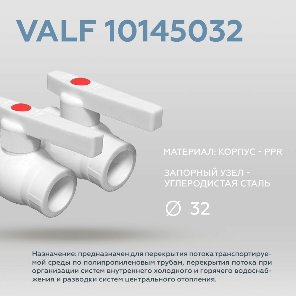 Кран шаровой 32 Optima металл. шар полипропиленовый PPR белый | код VALF 10145032 | VALFEX (2шт.в упак.)
